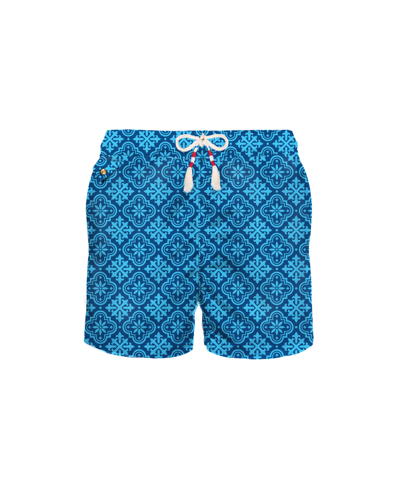 Man light fabric swim shorts Geometric print Quick drying Mid-length Light net lining Elasticated waistband Drawstring fastening Front and back pockets Care instructions: Cold hand wash. Do not soak. Do not iron. Do not dry off in contact with other garments. Rinse after contact with chlorine or salt water