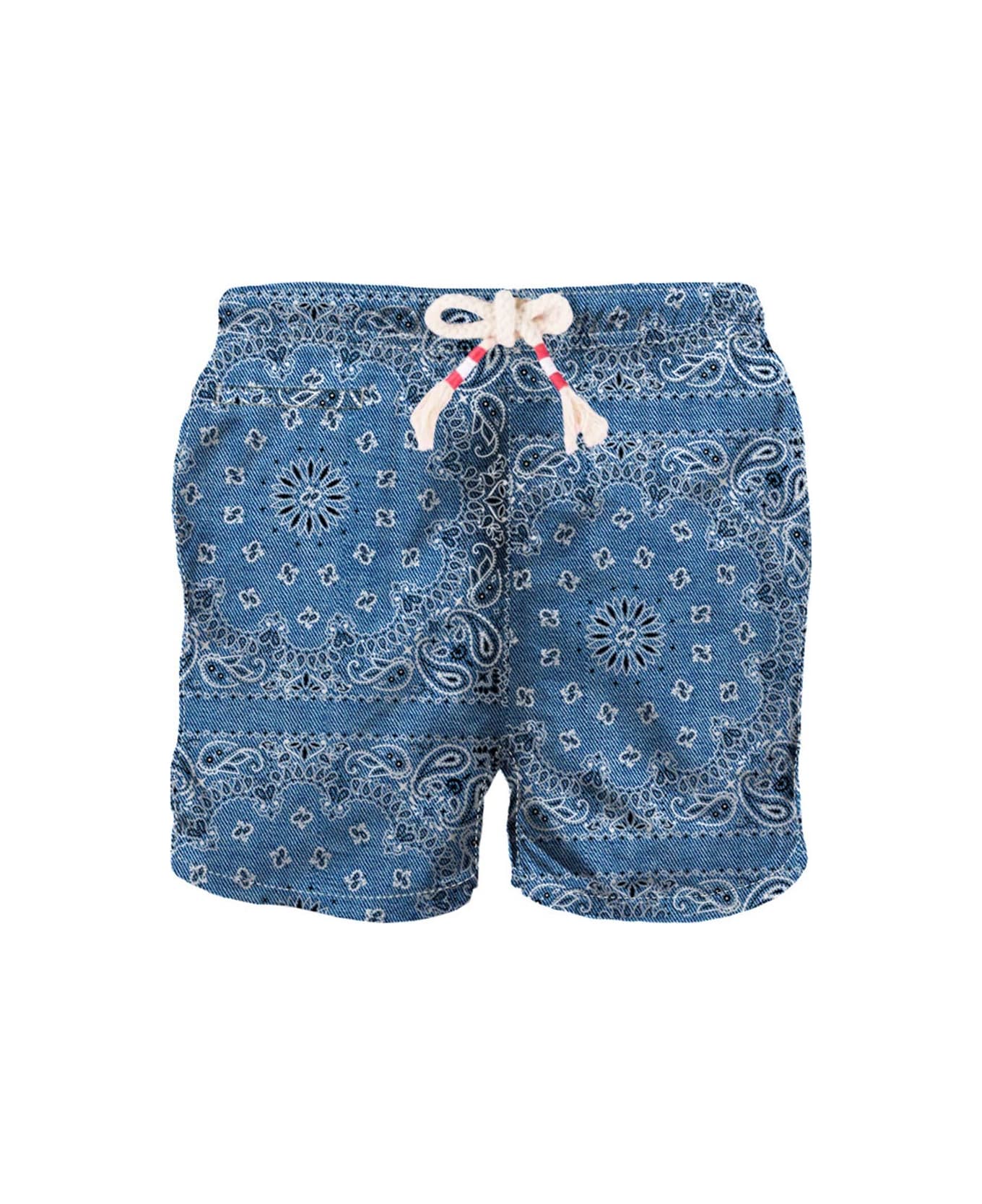 Man swim shorts Denim blue bandanna all over print True to size Light fabric Elasticated waistband Drawstring fastening Inner briefs Composition: 100% recycled fabric Care instructions: Cold hand wash. Do not soak. Do not iron. Do not dry off in contact with other garments. Rinse after contact with chlorine or salt water