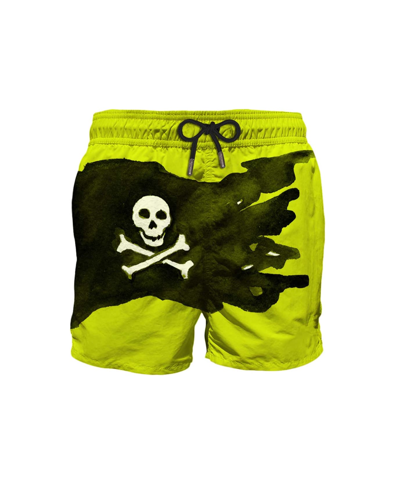 Man mid-length swim shorts Skull flag placed print Regular fit Comfortable drawstring waist Inside ergonomic briefs Drawcord closure CARE INSTRUCTIONS Cold wash by running water and neutral soap. Hang to dry.