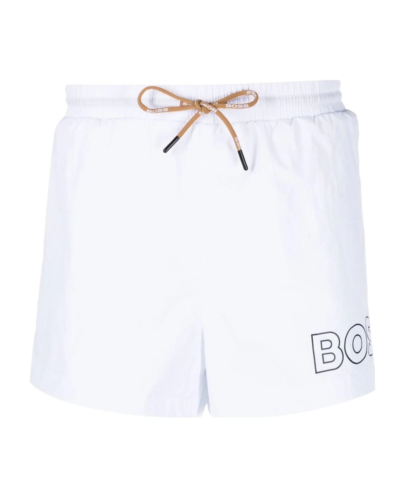 Modern beach boxers by BOSS Menswear in quick-drying white fabric. Fully lined for comfort, these sporty beach boxers feature a large printed BOSS logo on the left leg. Short design with elasticated waistband and side pockets. Drawstrings with plastic ends and an additional logo complete the garment.