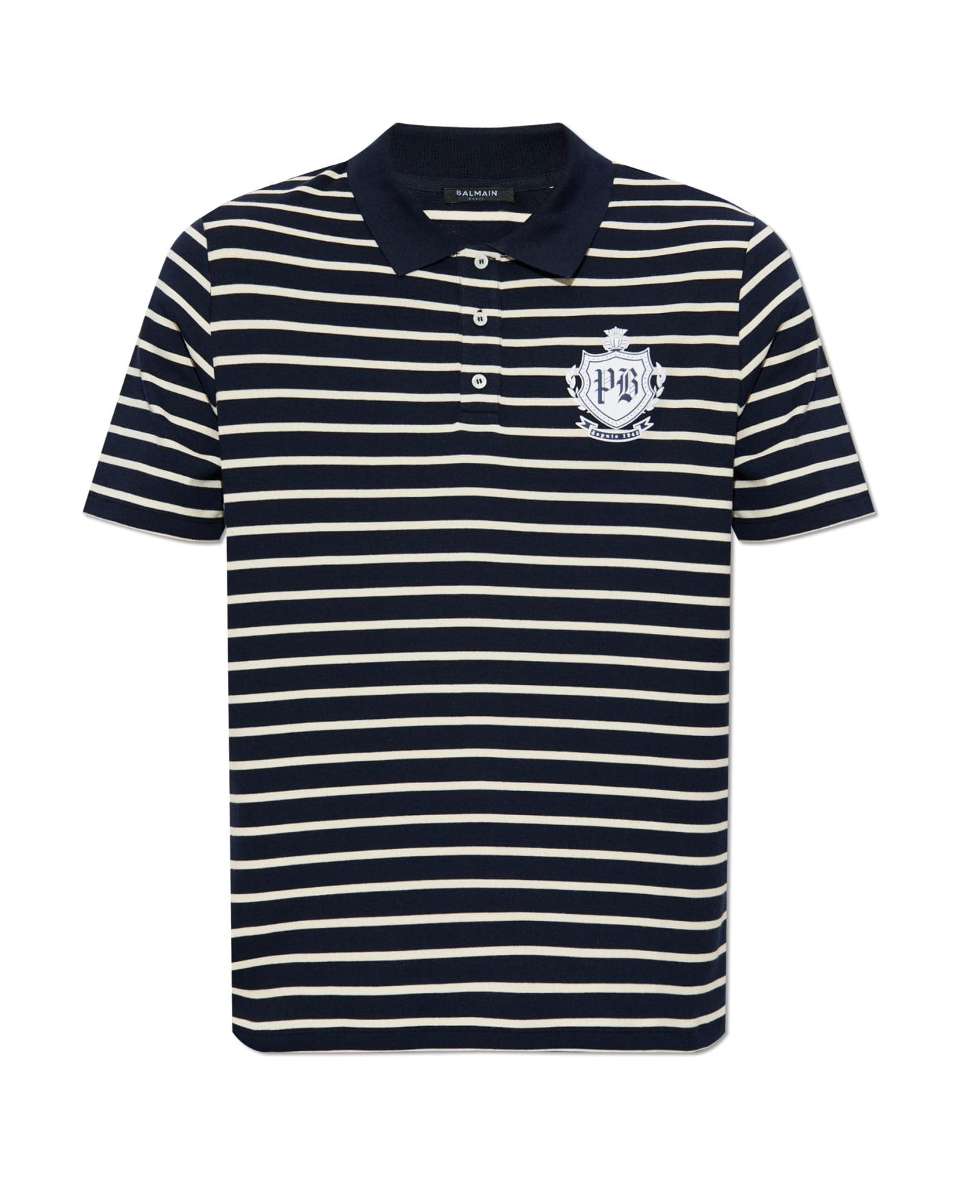 Elevate your wardrobe with this distinguished navy striped polo shirt by Balmain, an embodiment of refined Parisian heritage. Expertly crafted from a luxuriously ribbed fabric, this regular-fit polo features short sleeves and a traditional collar secured by three polished buttons. The striking interplay of crisp white stripes against a deep navy backdrop imparts timeless sophistication suitable for any setting. Signature elements accentuate its exclusivity: an embroidered crest with PB initials adorns the chest, while the unmistakable Balmain inscription graces the nape. Meticulous tailoring and the selection of enduring, comfortable materials highlight Balmain's commitment to excellence making this shirt a remarkable statement of style and distinction. Why choose this product? Heritage craftsmanship from one of France's most esteemed fashion houses Exquisite ribbed material for superior comfort and durability Iconic embroidered logo and designer detailing for unmistakable elegance Versatile, classic design suitable for both casual and formal occasions