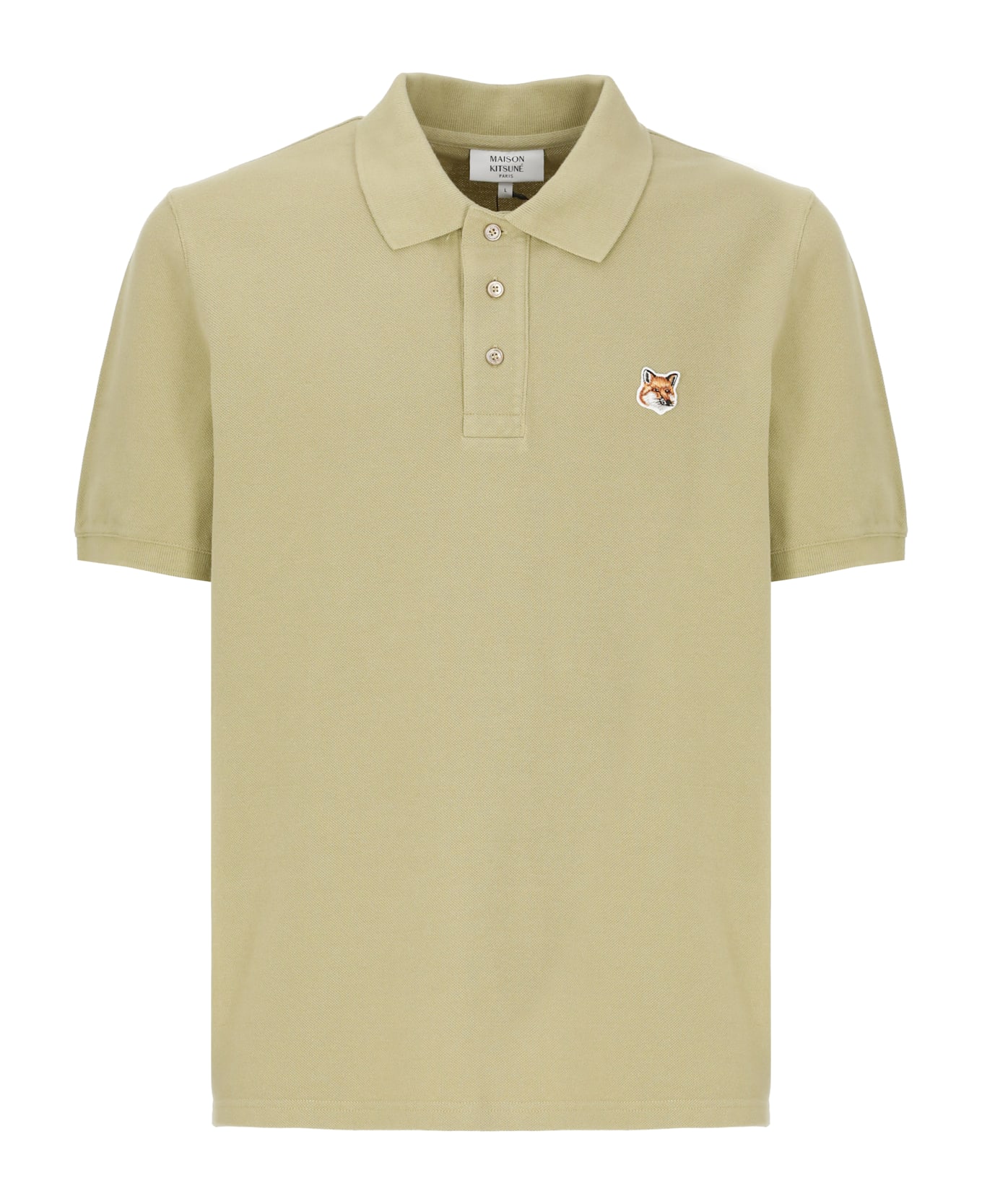 - Green Maison Kitsune cotton three buttons polo shirt for man - Collar - Short sleeves - Front Fox Head patch
