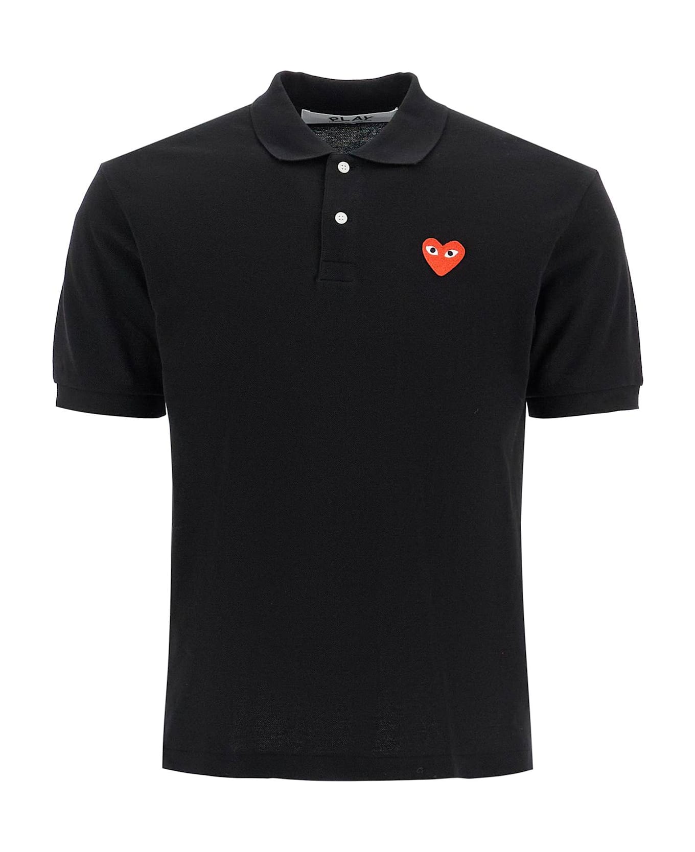 Short-sleeved polo shirt from the Comme Des Garçons Play collection crafted in cotton piqué with a signature Heart logo embroidered at the chest. A two-button placket, ribbed collar and cuffs, and side vents with dropped back hem complete the design. Regular fit. The model is 187 cm tall and wears a size L.