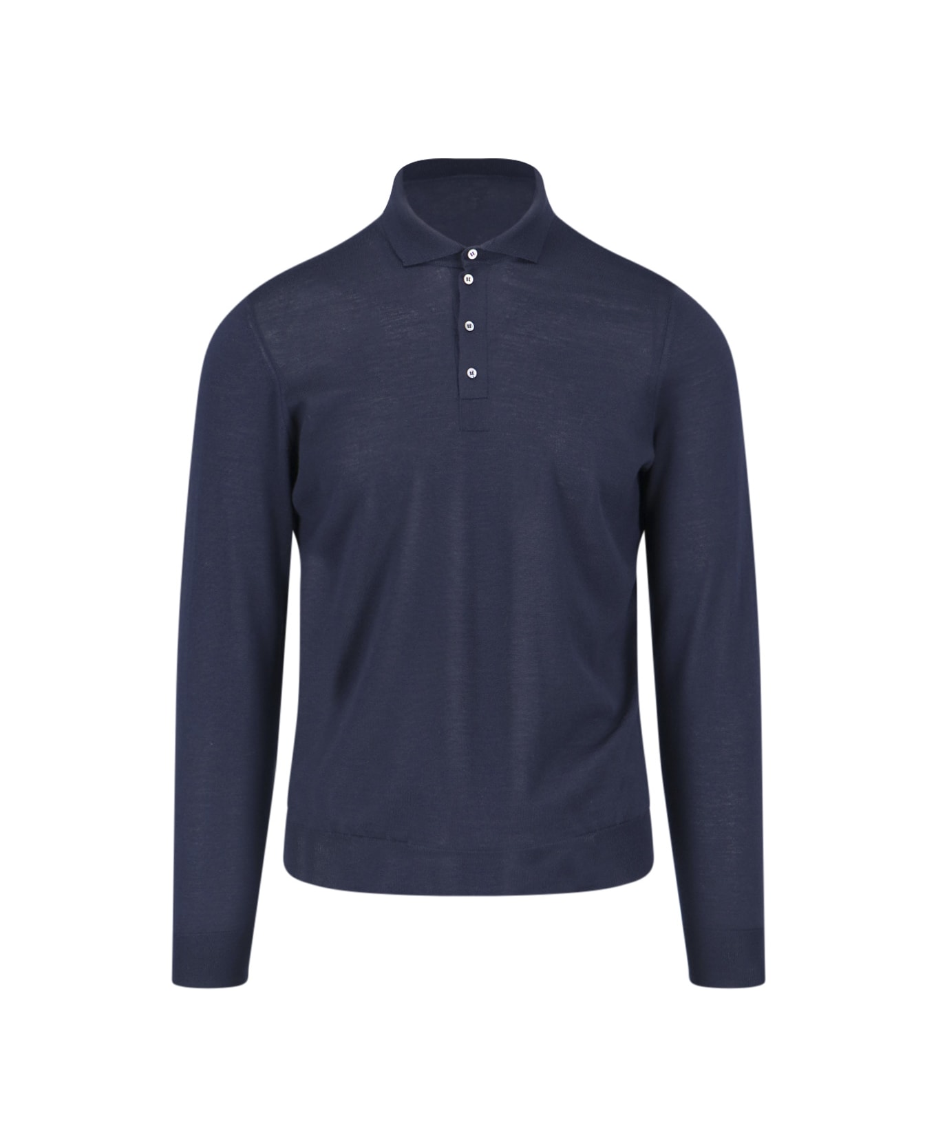 Drumohr knit polo shirt in blue wool with classic collar, front buttons, ribbed trim, and straight hem.