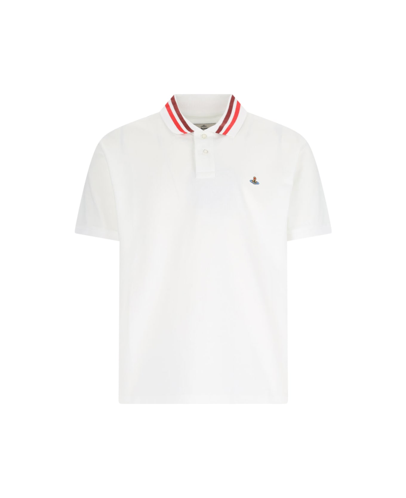 Vivienne Westwood 'Orb' logo t-shirt in white cotton with contrast blue trims, classic collar, snap buttons on the front, short sleeves, straight hem. Composition: 100% Cotton