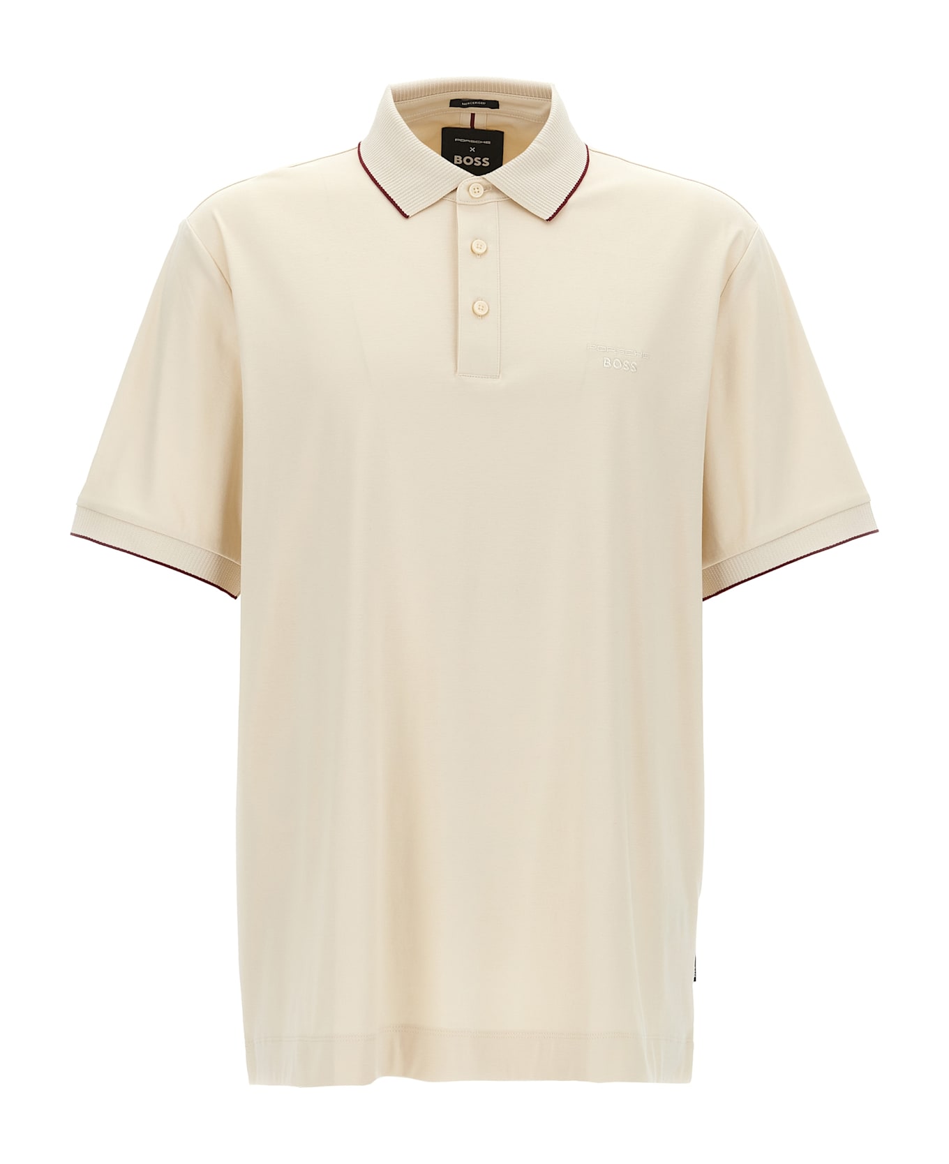 Porsche x BOSS capsule 'Prout 400' polo shirt in mercerized cotton with front logo embroidery, ribbed collar and buttons, short sleeves, and contrasting piping on the collar and sleeves.