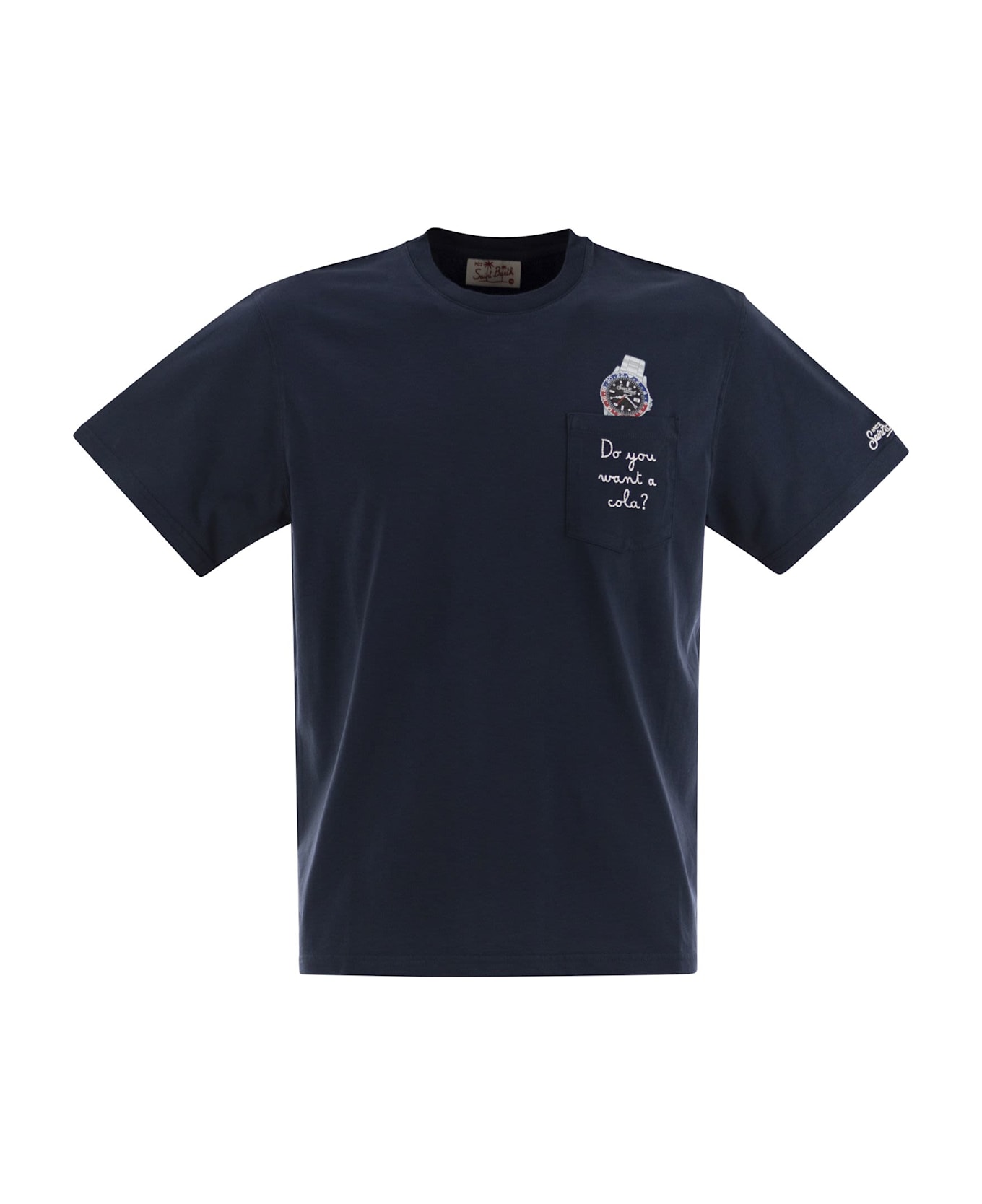 Introducing the Austin T-shirt, a timeless cotton jersey t-shirt that is a wardrobe staple. Featuring short sleeves and a front pocket adorned with intricate embroidery and trompe-l'oeil prints, this t-shirt offers a unique twist on classic style. Complemented by the embroidered Saint Barth logo on the left sleeve, it is an essential piece to wear repeatedly away from home. - Classic fit - Patch pocket on left chest with embroidery - Crew neck - Exclusive St. Barth embroidery on sleeve DESIGNER ID: AUS0001 02529H