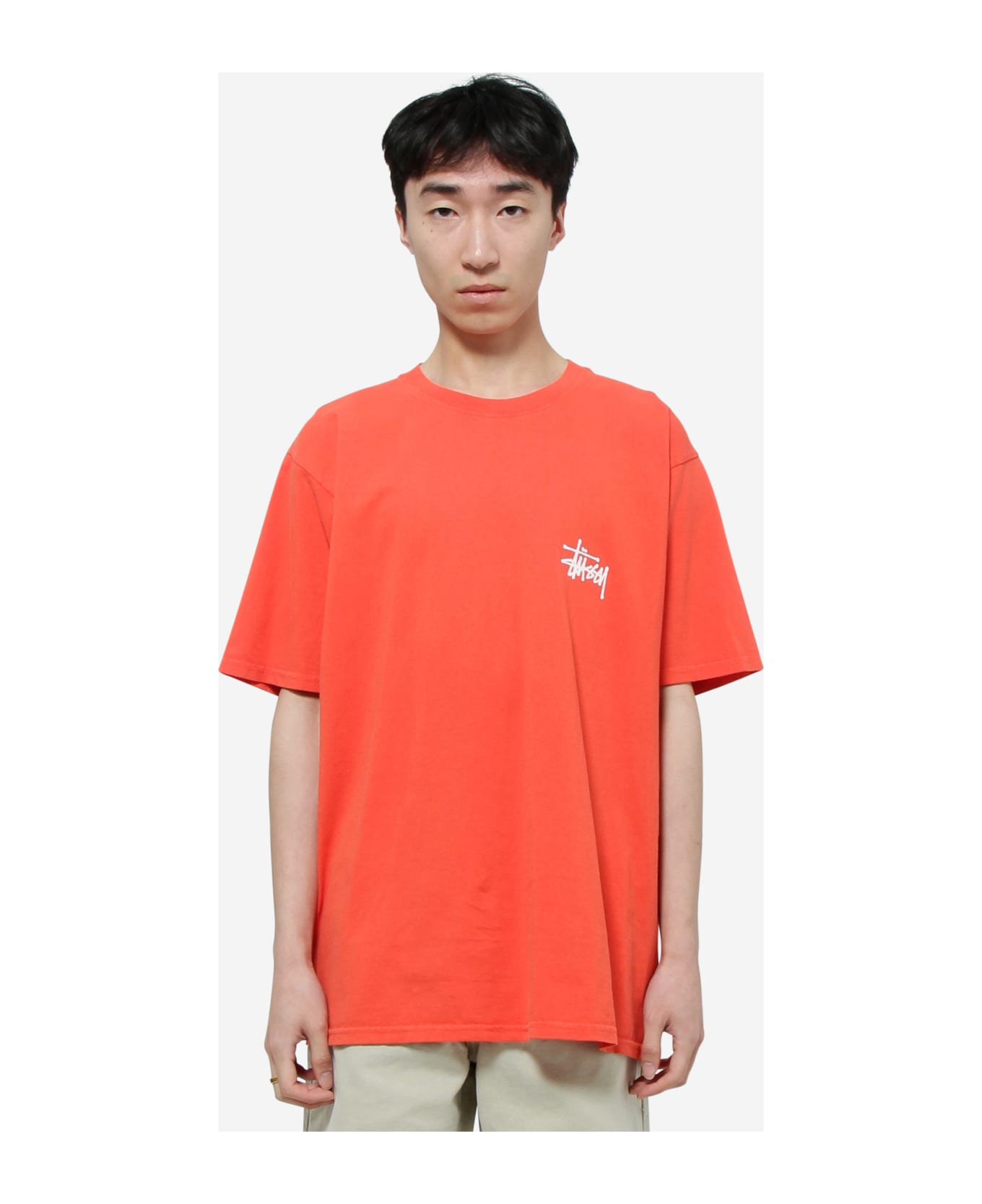 BASIC STUSSY T-Shirt in red cotton, crew-neck, short sleeves, straight hem, front and back logo