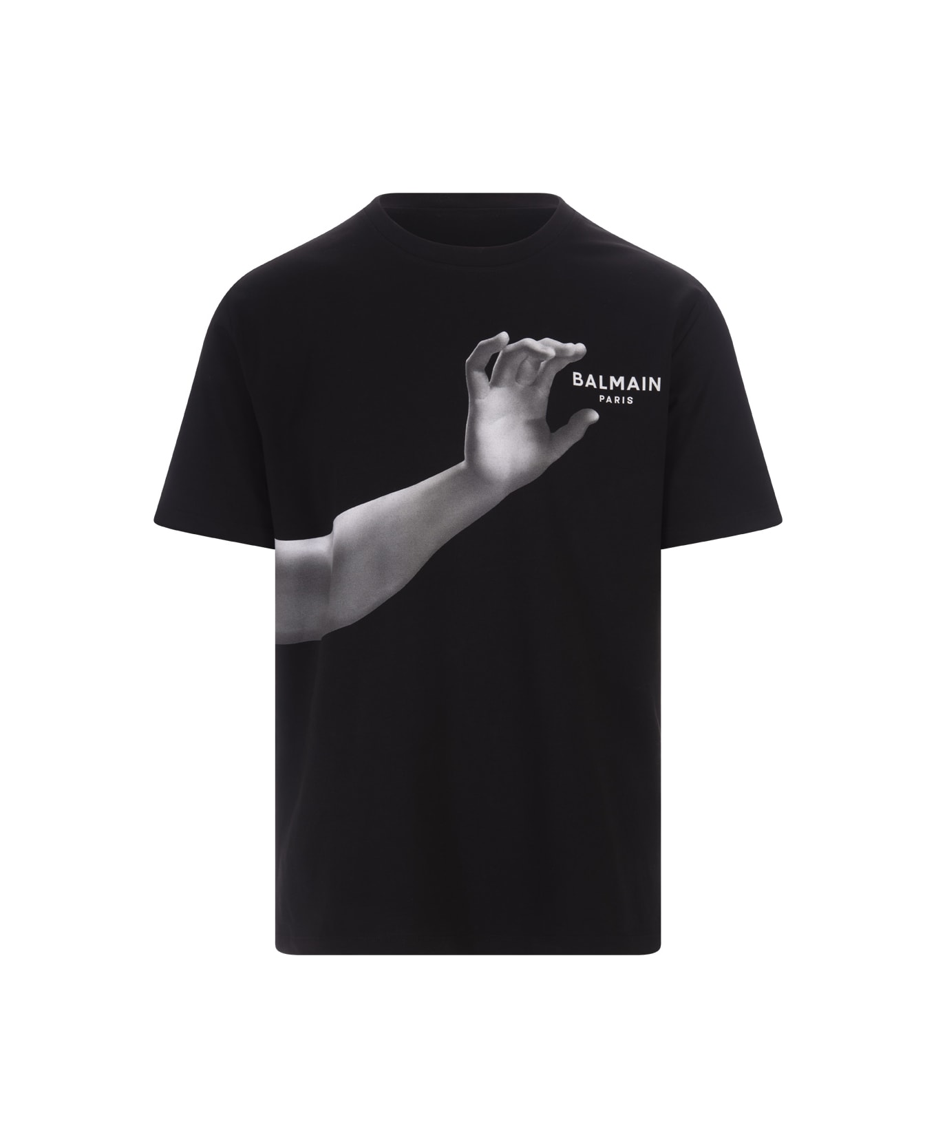 Black cotton Balmain oversize t-shirt with round neckline, short sleeves, Statue print on front and white Balmain Paris logo printed on left chest. Classic fit. For a tighter fit, choose one size smaller.