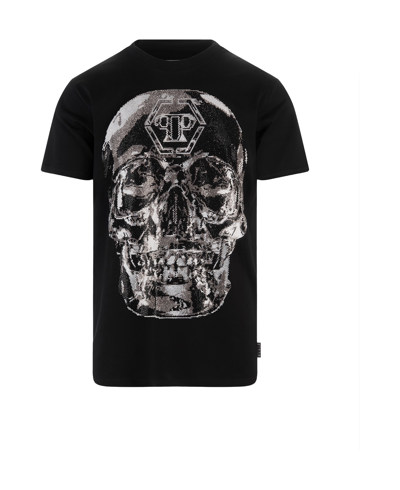 Philipp Plein t-shirt made of black cotton jersey with round neckline, short sleeves, iconic rhinestone skull on the front and PP Hexagon saffiano leather appliqué on the back.