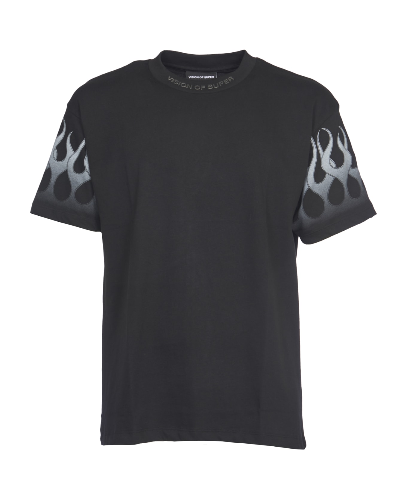 Black cotton T-shirt with contrasting flames print on the sleeves. T-shirt with Vision of Super logo embroidered on the crew neck. Model with half sleeves and round neck. -100% cotton