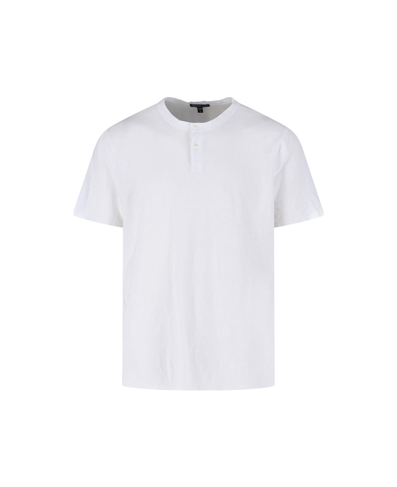 Classic James Perse white cotton crew neck t-shirt with button closure, short sleeves, straight hem.
