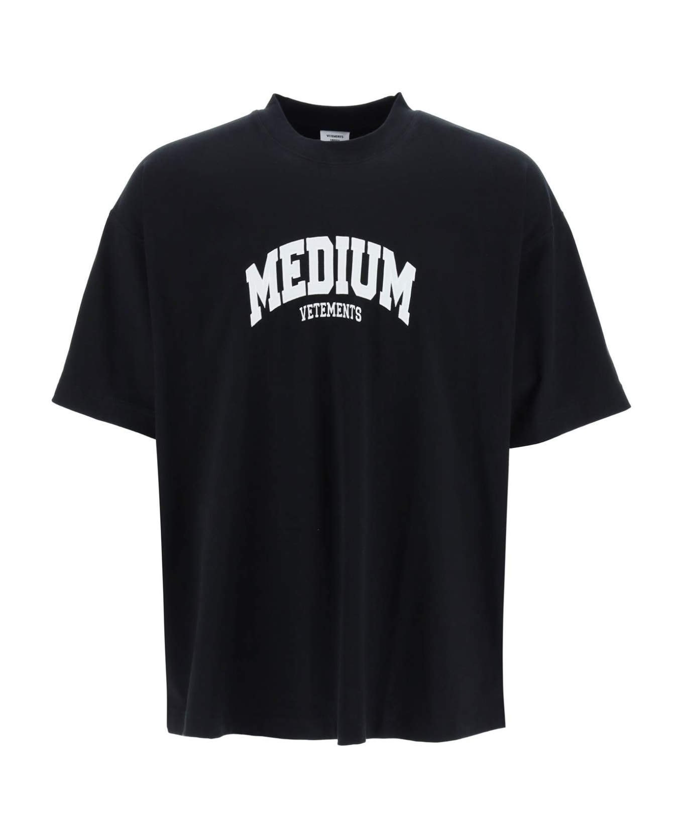 Unisex cotton jersey t-shirt by Vetements featuring ribbed crewneck. Characterized by contrasting lettering patch at front and tone-on-tone embroidered logo detail at back. Oversized fit. The model is 187 cm tall. Composition: 100% CO