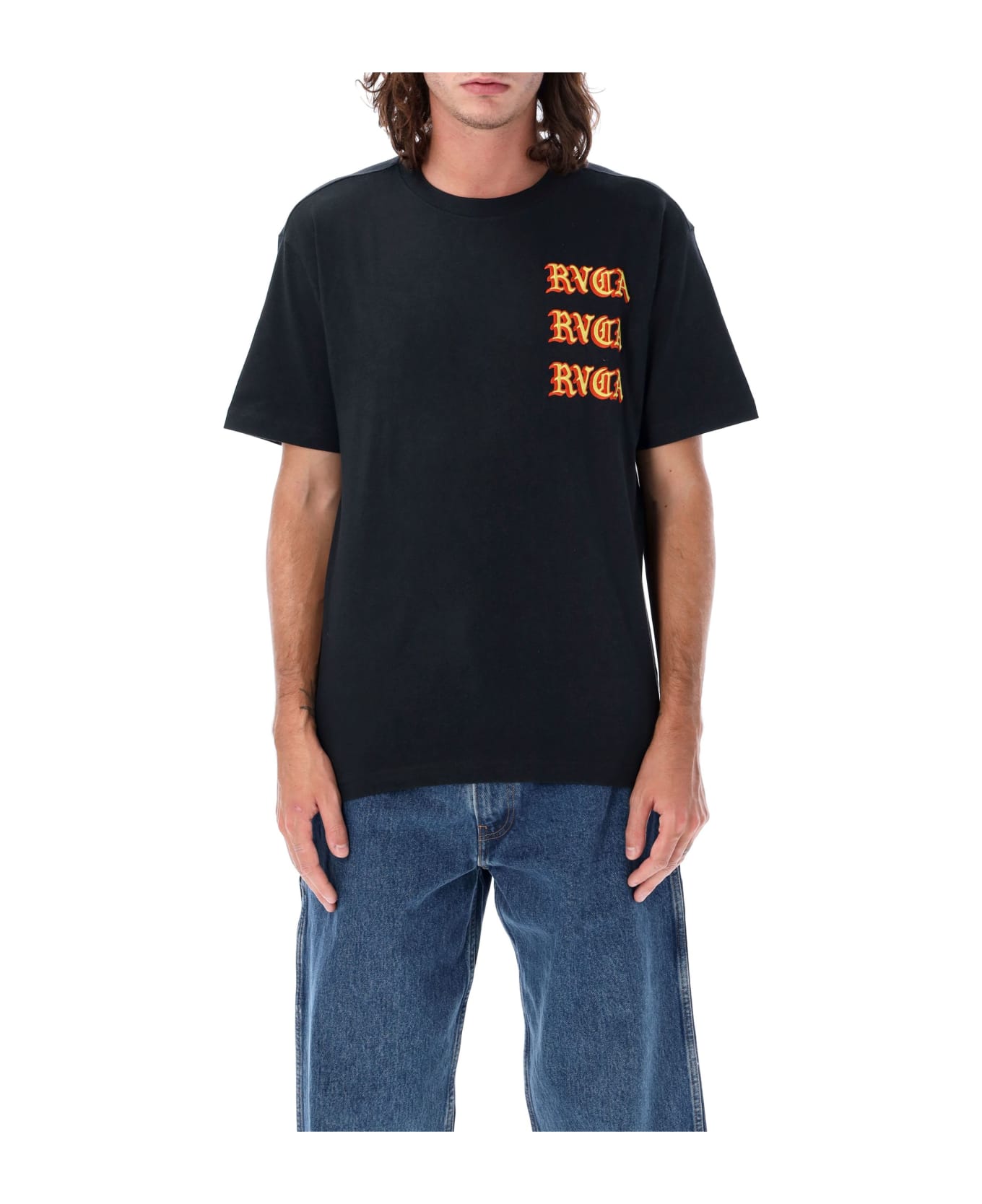 Del Toro T-shirt By Rvca. Featuring: Crew Neck Short Sleeves Embroidered Logo At Chest Print At Back Regular Fit Model Is 1,90 M Tall And He Is Wearing Size L