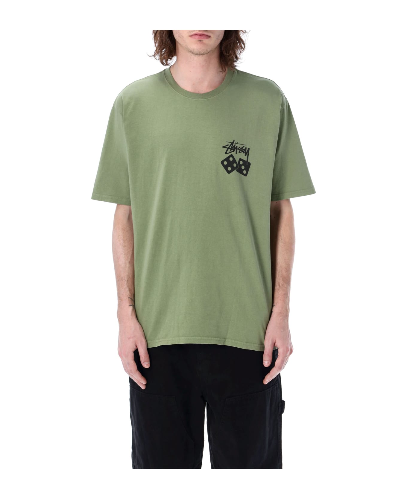 Cotton Dice Pigment Dyed Tee By Stüssy. Featuring: Ribbed Crew Neck Short Sleeves Screenprinted Graphics At Chest And Back Straight Hem The Model Is 1,90 M Tall And He's Wearing Size L