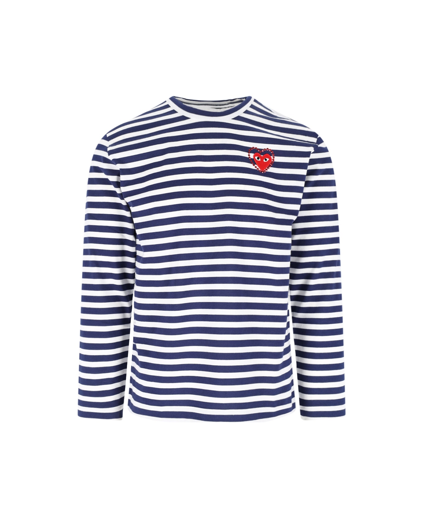 Comme des Garçons Play striped t-shirt with "Emblem" rhinestones in white cotton with blue striped pattern, long sleeves, crew neck, red heart logo patch on the chest, red rhinestone applied detail, straight hem.