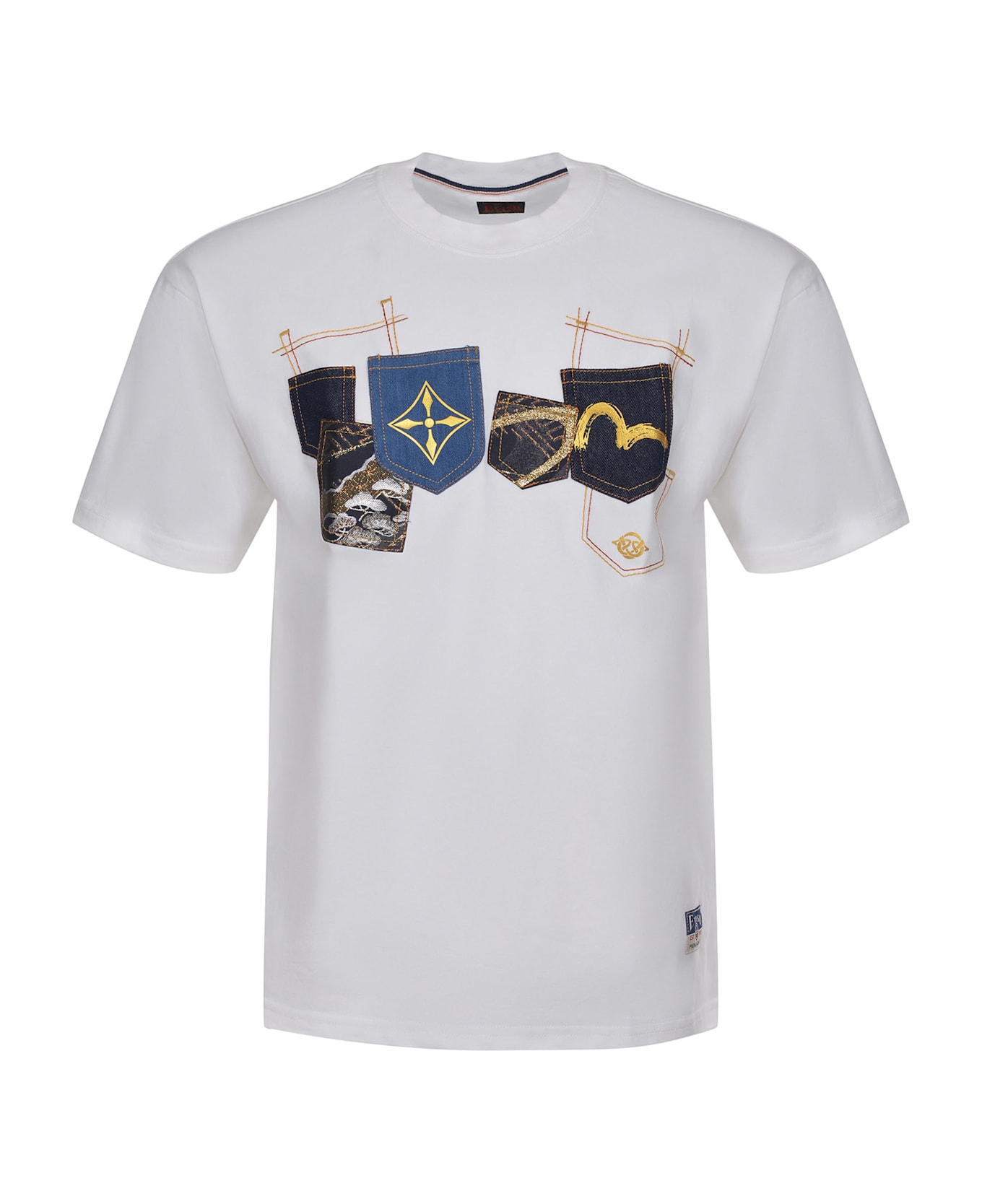Evisu T-shirt made of white cotton. Ribbed crew neck. Short sleeves. Embossed pockets on the chest in contrast with embroidered motifs and logo. Logo patch on the bottom. Contrasting lettering on the back of the crew neck. 100% cotton