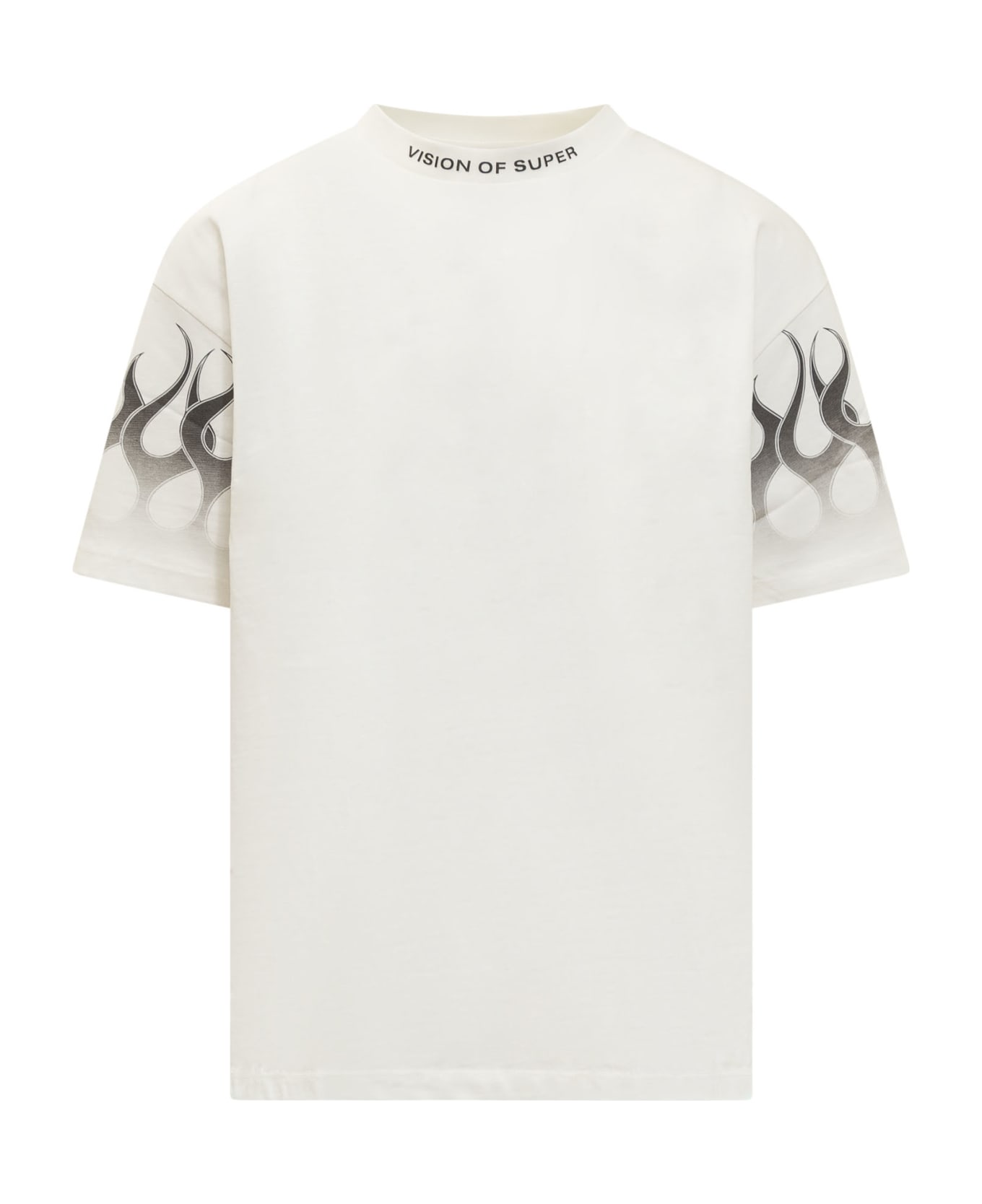 White short-sleeved t-shirt. Crew neck. Logo printed on the neck. Flames print on the sleeves. Ribbed collar.