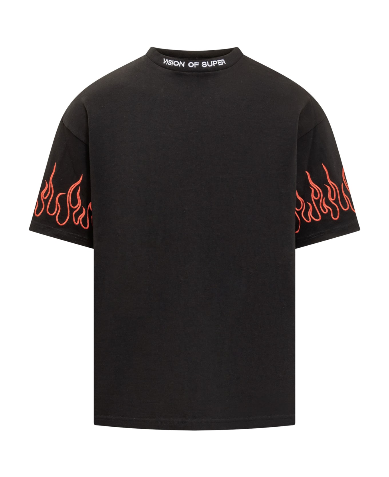 Short-sleeved black t-shirt. Crew neck. Embroidered logo on the front. Flame embroidery on the sleeves. Ribbed collar.