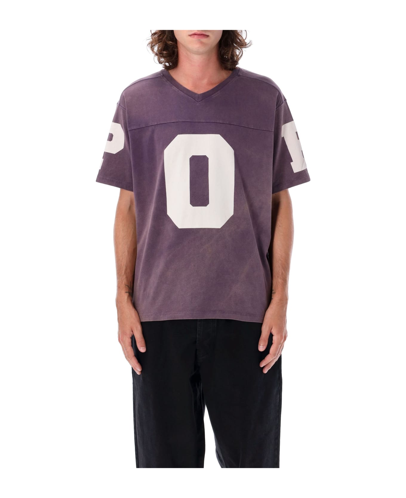Football T-shirt By Pop Trading Company. Featuring: Oversized Fit Cotton Fabric With A Washed Finish V-neck Collar Short Sleeves With Printed Graphics Large Graphic "0" On Front, Numbers On Sleeves Model Is 1,90m And Wears Size L.