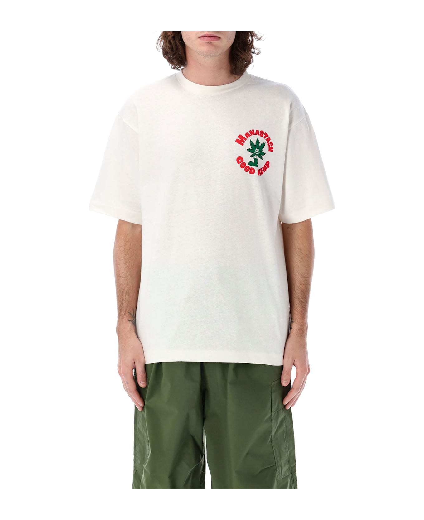 Hemp And Cotton Blend Hemp T-shirt Good Hemp By Manastash. Featuring: Ribbed Crew Neck Short Sleeves Graphic Logo At Chest Large Lgraphic Logo Print At Back Model Is 1,90 M And Wears Size L