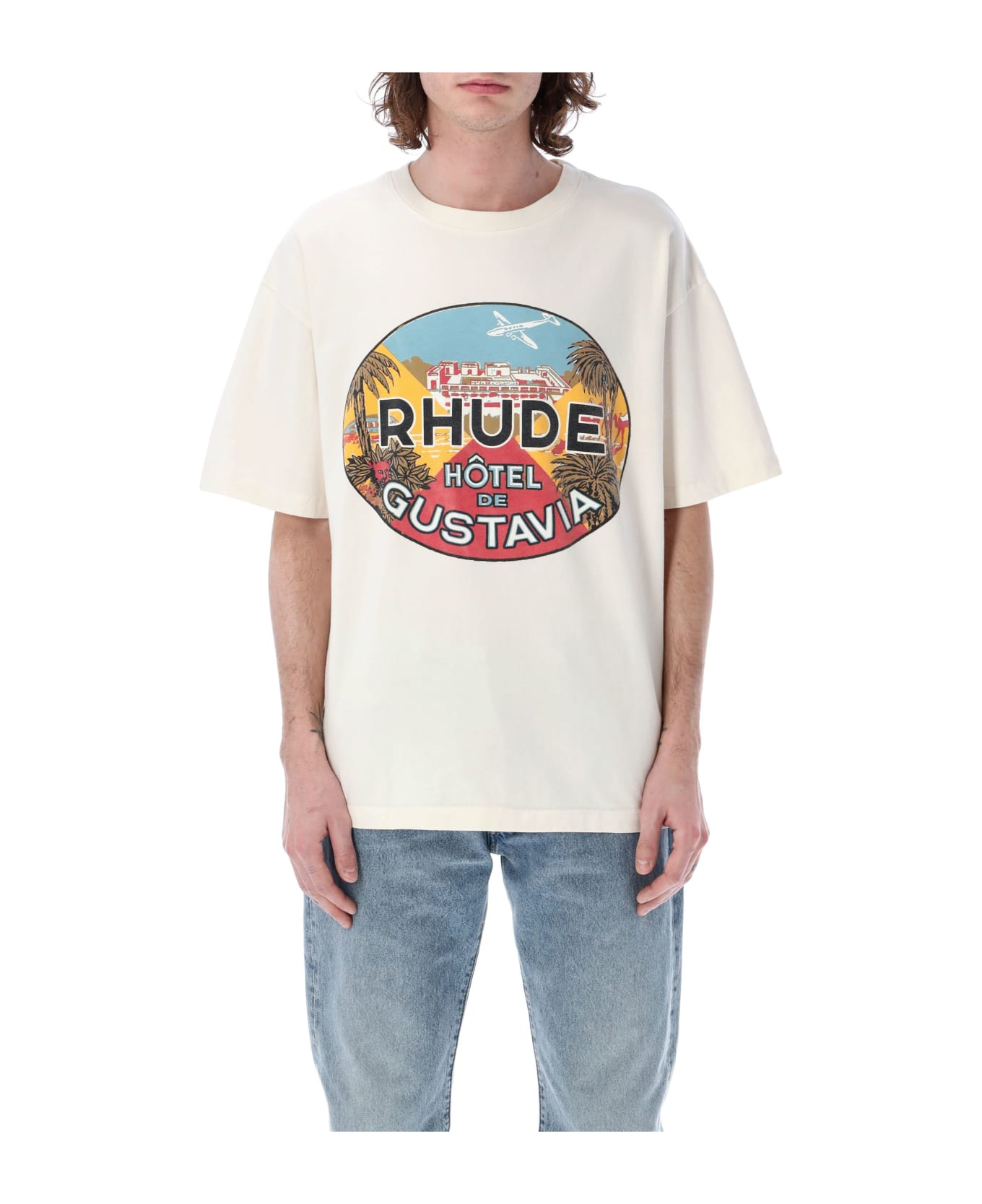 Cotton Hotel De Gustavia T-shirt By Rhude. Featuring: Ribbed Crew Neck Short Sleeves Multicolor Graphic Print At Front Loose Fit The Model Is 1,90 M Tall And He's Wearing Size L