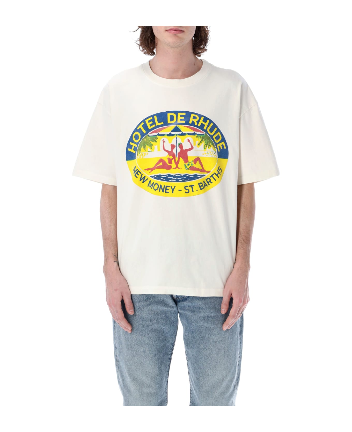 Cotton Hotel De Rhude T-shirt By Rhude. Featuring: Ribbed Crew Neck Short Sleeves Multicolor Graohic Print At Front Loose Fit The Model Is 1,90 M Tall And He's Wearing Size L
