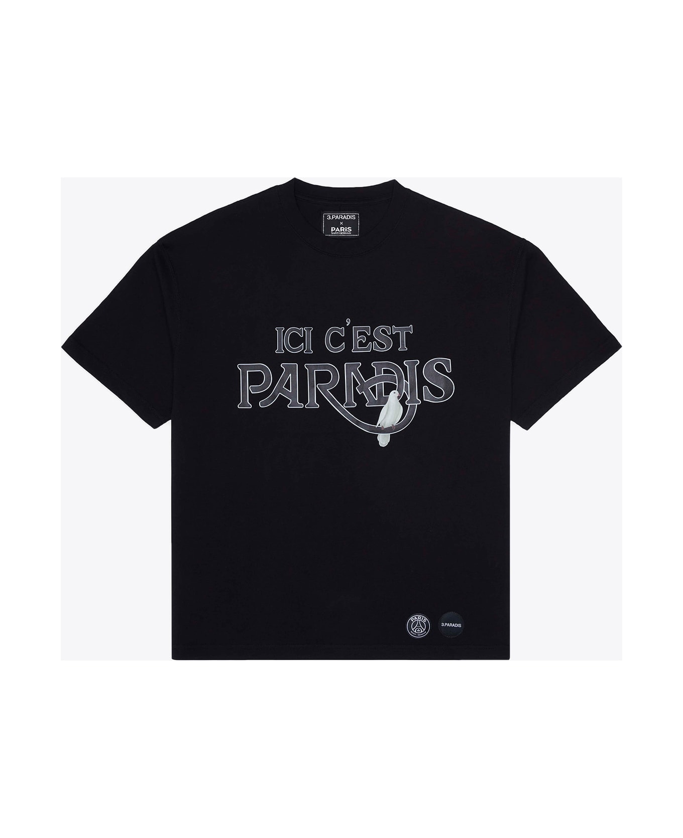Pairs Saint-Germain collab black cotton t-shirt with ribbed crewneck. Front slogan print with bird ICI CEST PARADIS. Regular fit. Composition: 100% cotton.
