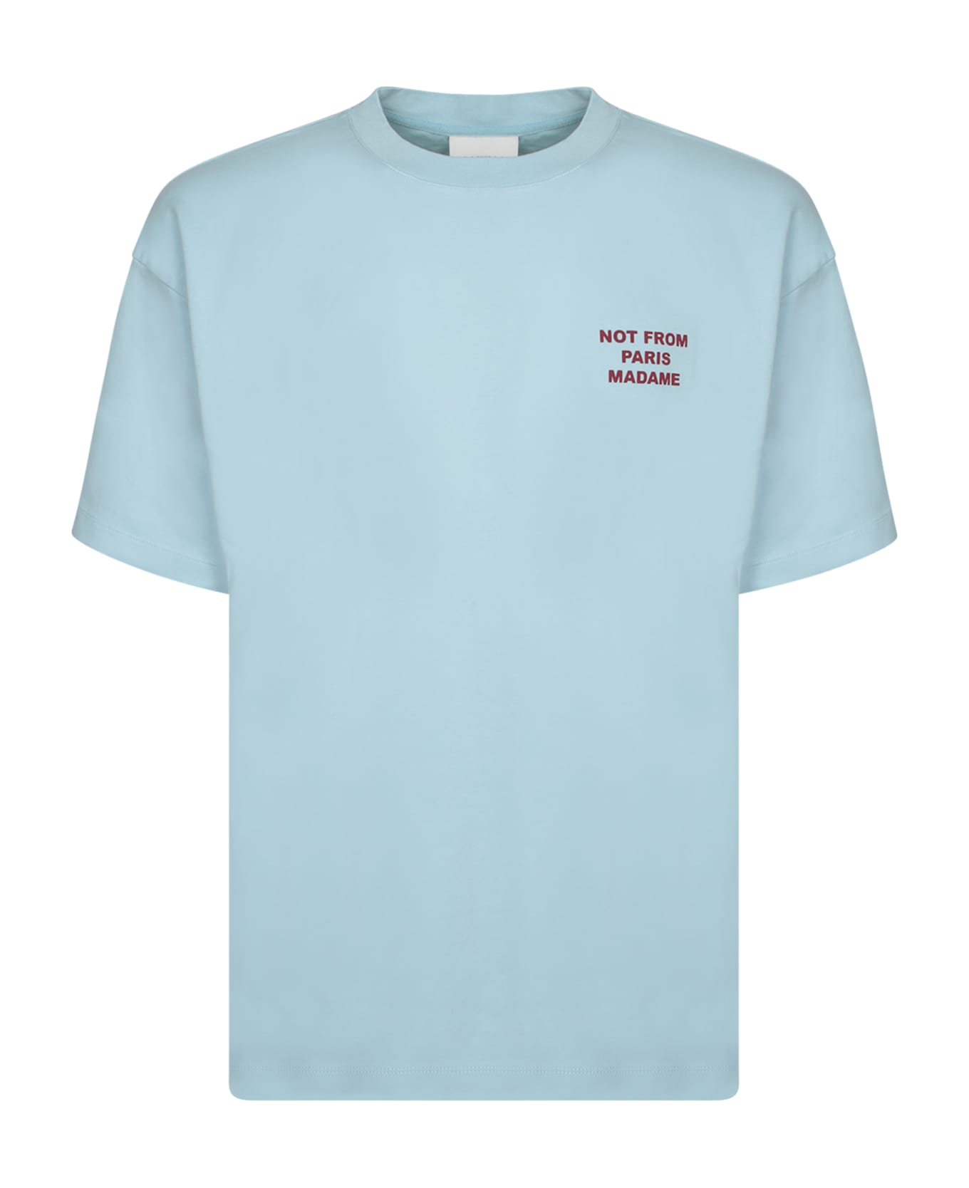 Crafted in soft cotton, this light blue t-shirt features a bold 'NOT FROM PARIS MADAME' slogan print, adding a touch of irony and unique style.
