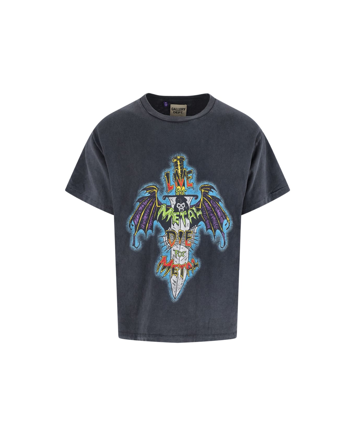 Gallery Dept. 'Live for metal' grey cotton t-shirt with distressed effect, crew neck, dropped shoulders, contrast maxi logo print on the front, logo print on the back, ribbed trims, straight hem.