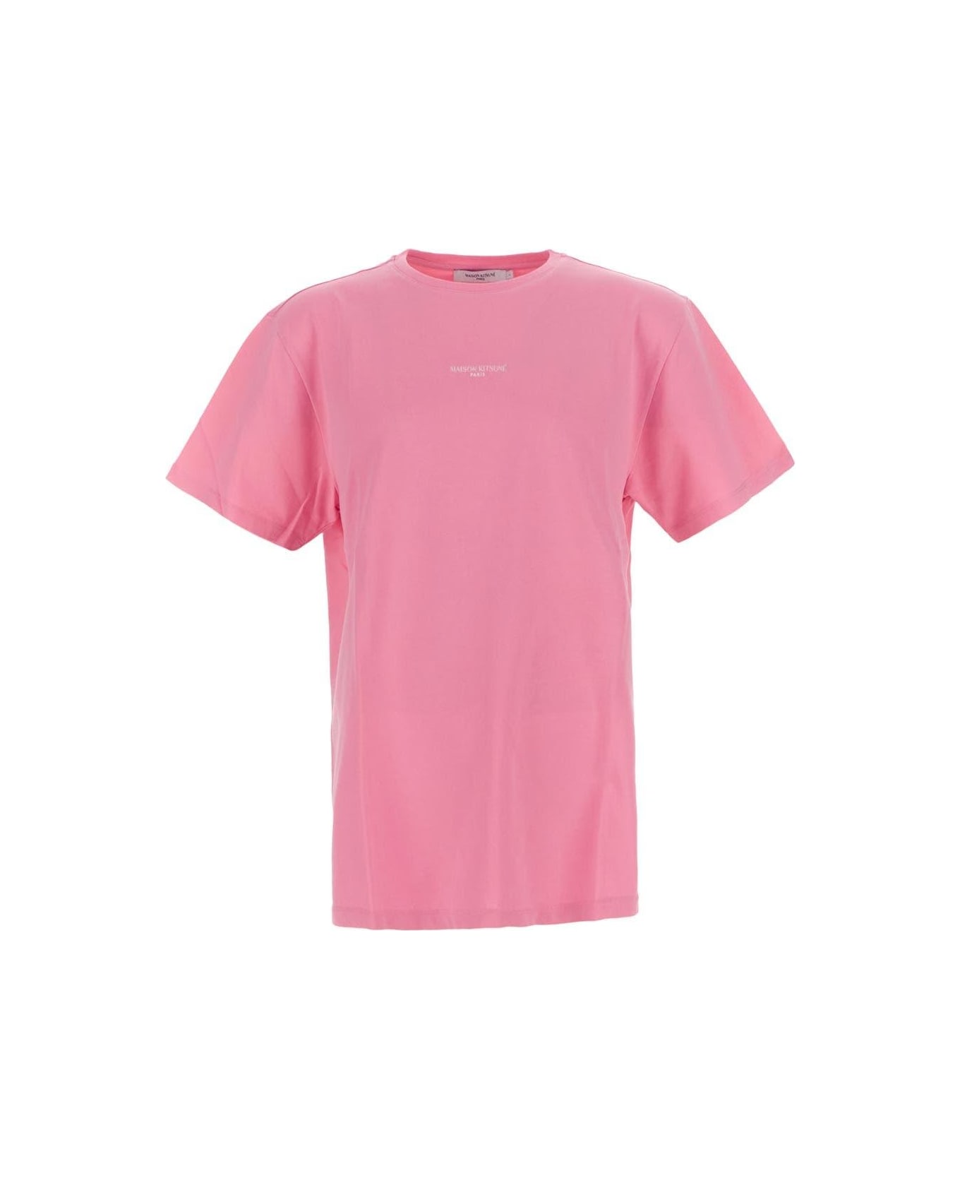 Maison Kitzune' t-shirt in dusty rose cotton featuring elastic ribbed crew neck, short sleeves, relaxed fit and white embroidered logo patch on the chest.
