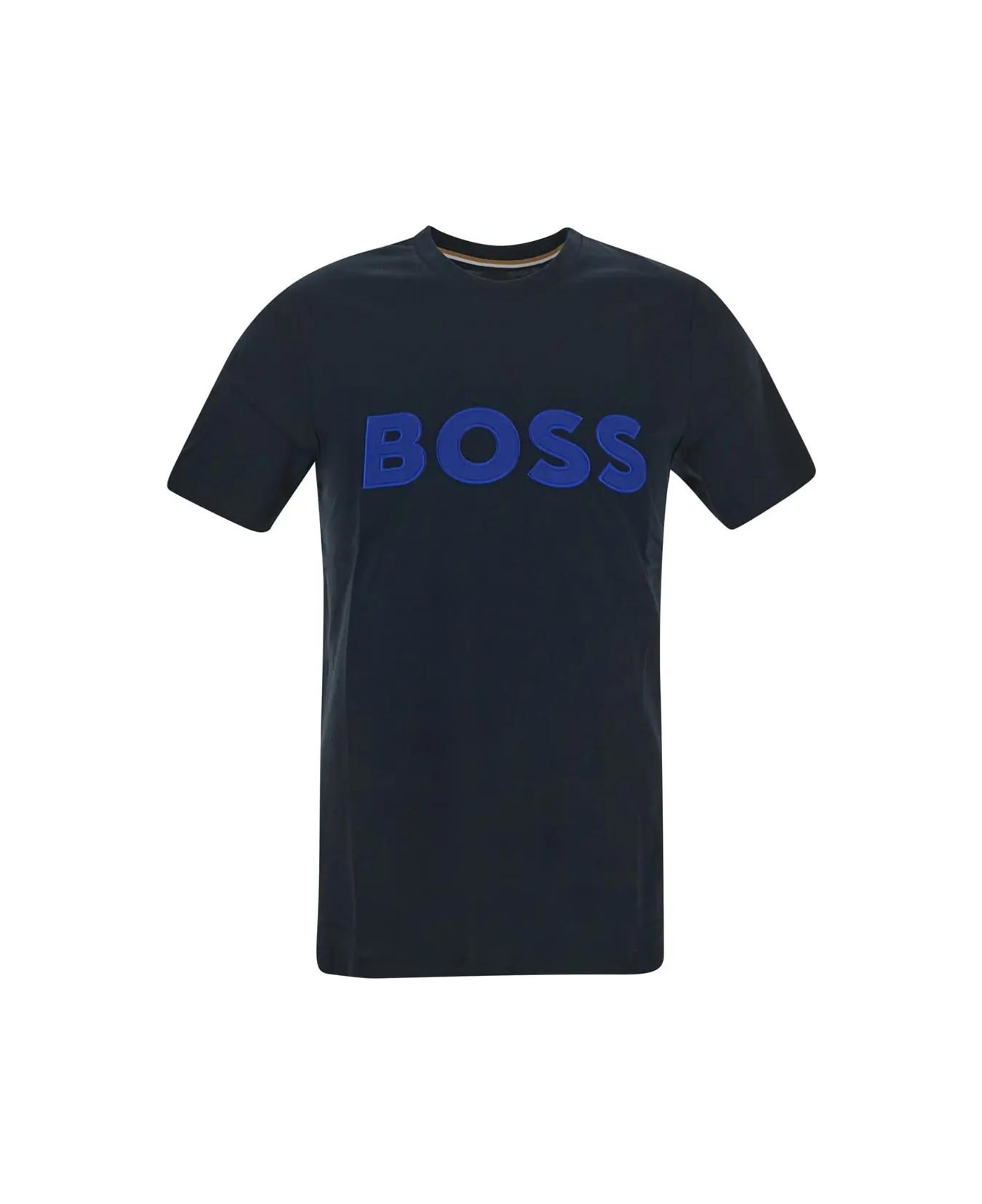 Boss t-shirt in black cotton with short sleeves. The item is featured by crewneck and blue embroidered logo.