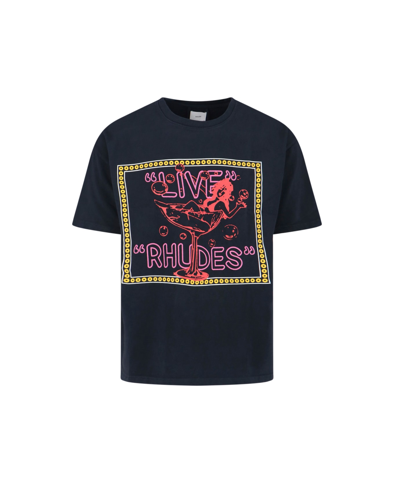 Rhude logo T-shirt in black cotton with crew neck, short sleeves, maxi front logo print, straight hem.