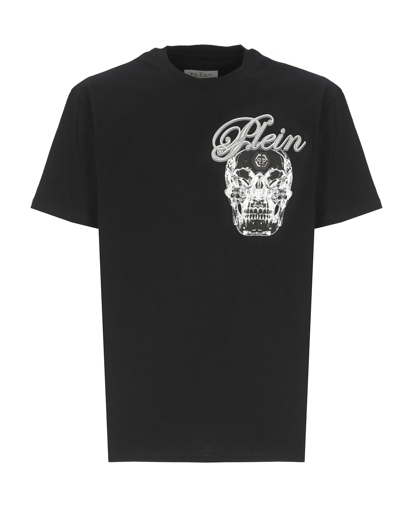 - Black Philipp Plein cotton t-shirt for man - Crew neck - Short sleeves - Front contrasting color print with logo