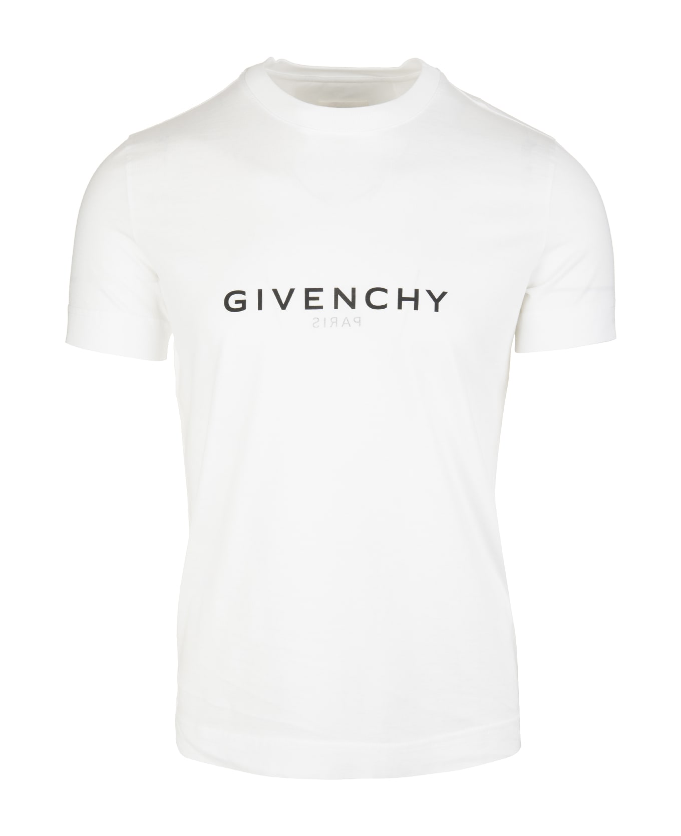 GIVENCHY men's white slim fit t-shirt made of soft cotton jersey and featuring crew neck, short sleeves, straight bottom, small black 4G logo printed on the back and black inverted GIVENCHY Paris signatures printed on the front and back.