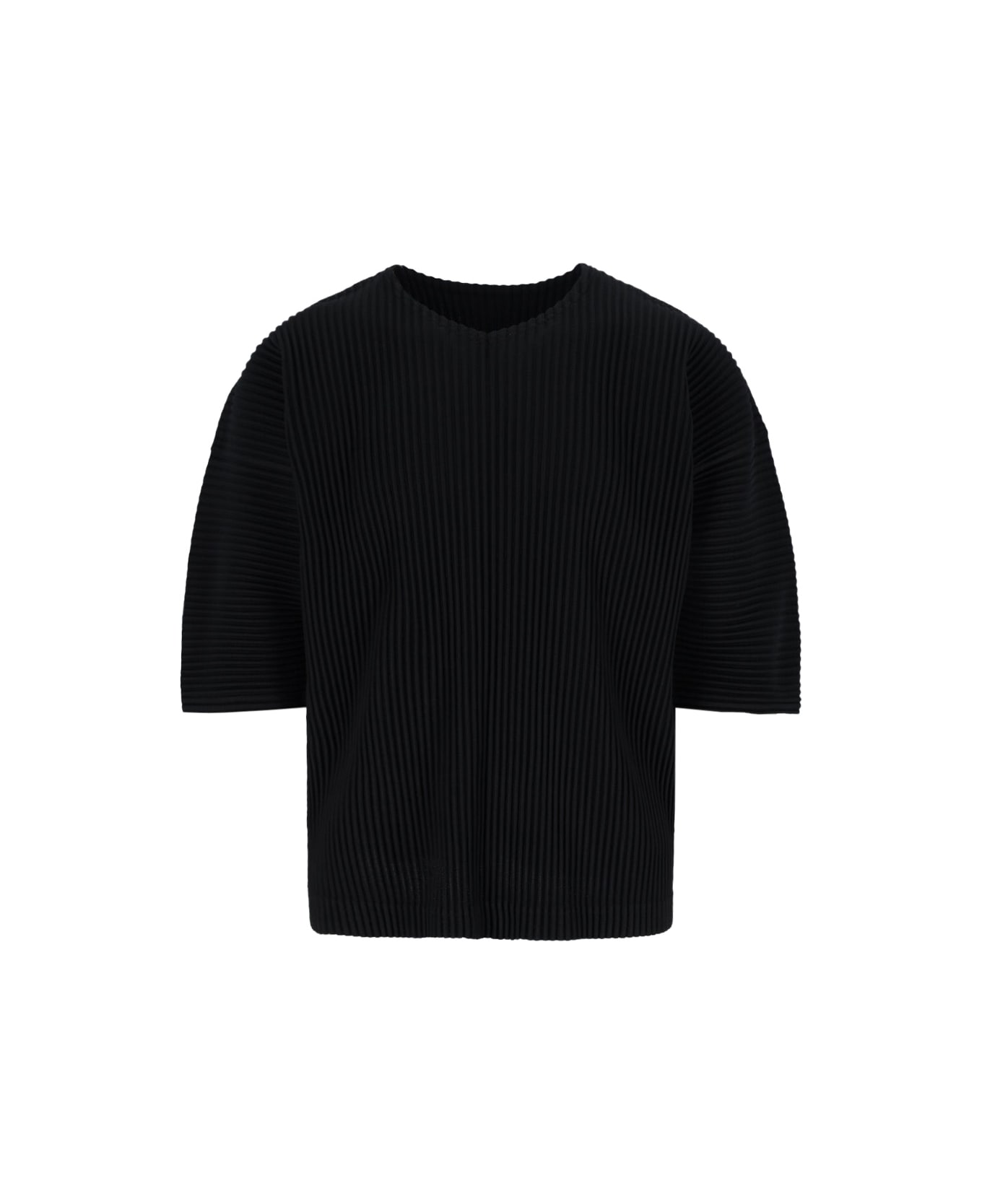 Homme Plissé 'MC March' pleated t-shirt in black fabric with pleated design, V-neck, short sleeves, straight hem.