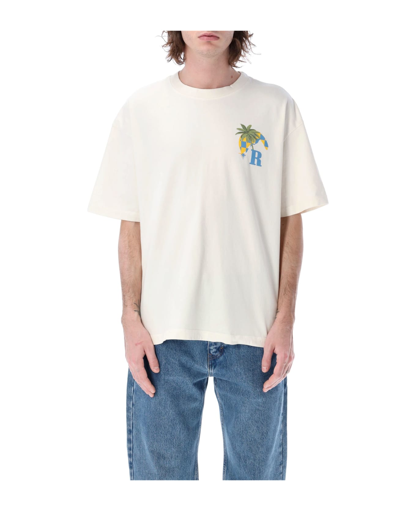 Cotton Moonlight Tropics Tee By Rhude. Featuring: Ribbed Crewneck Short Sleeves Small Graphic Print At Left Chest And Big Print At Back Straight Hem Model Is 1,90 M Tall And He Is Wearing Size L