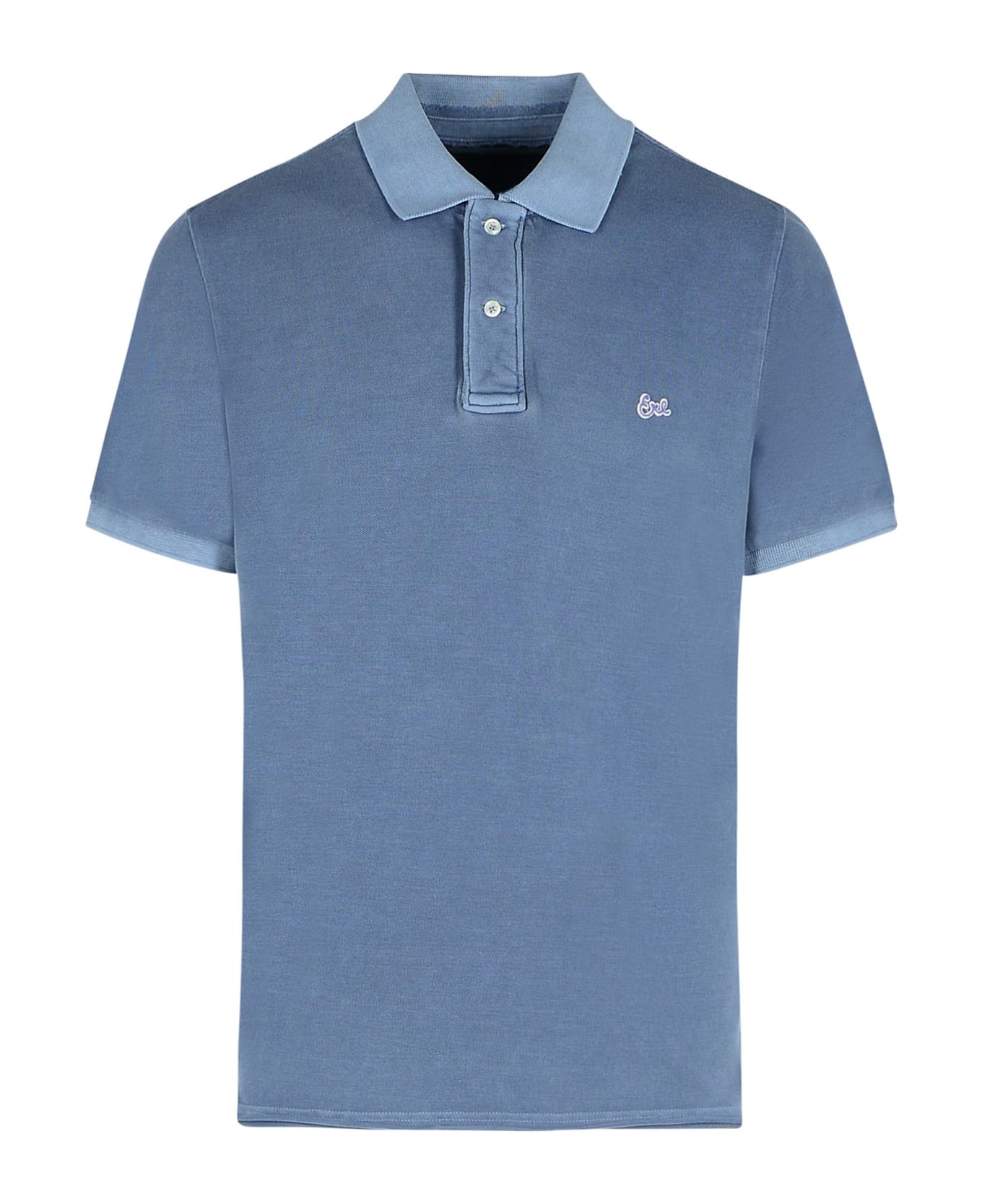 Finished collar, partial button closure, contrast logo