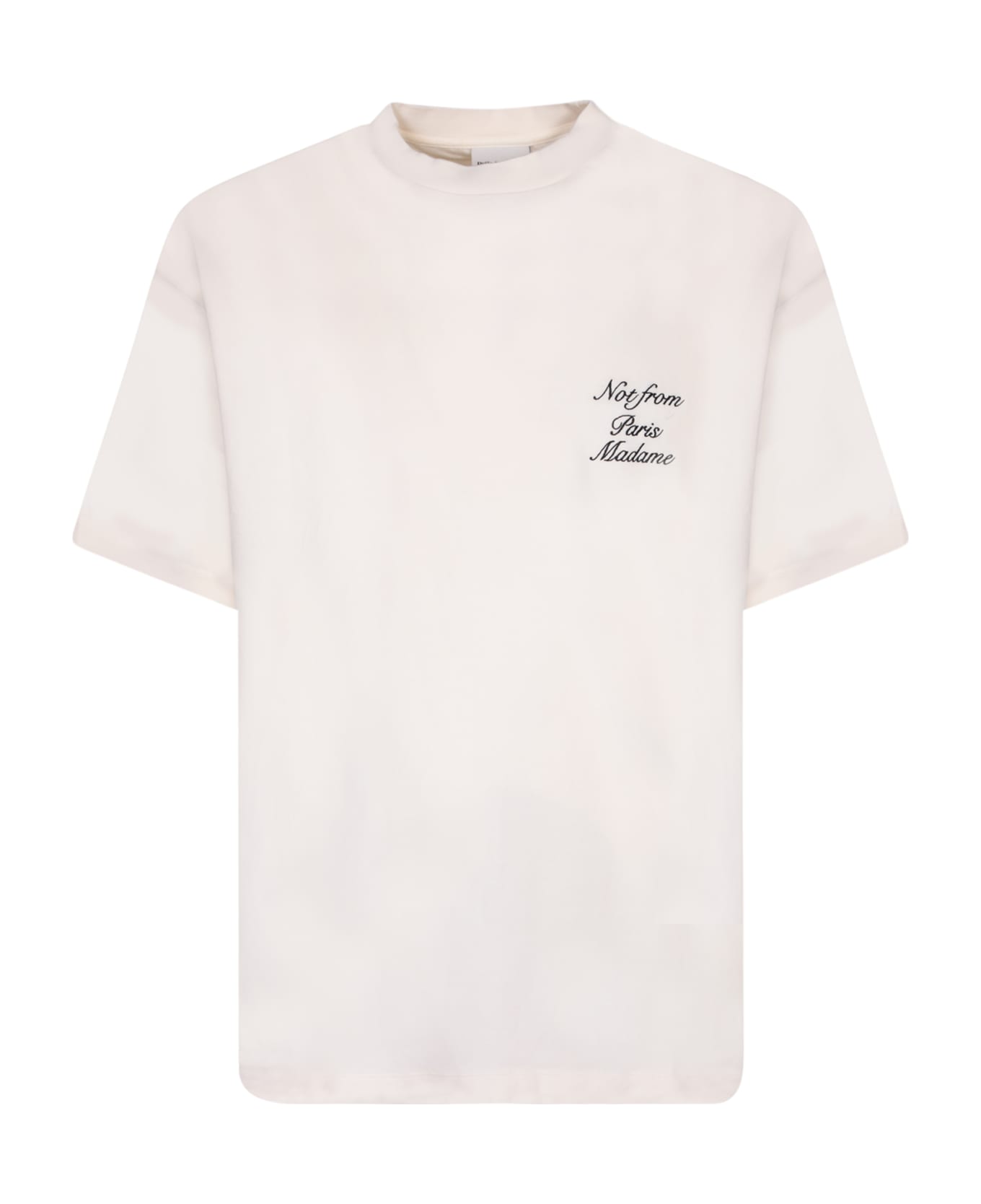 This Drole De Monsieur T-shirt features a relaxed fit in a solid color, adorned with a striking 'Not From Paris Madame' print on the chest, adding a distinctive flair to the piece.