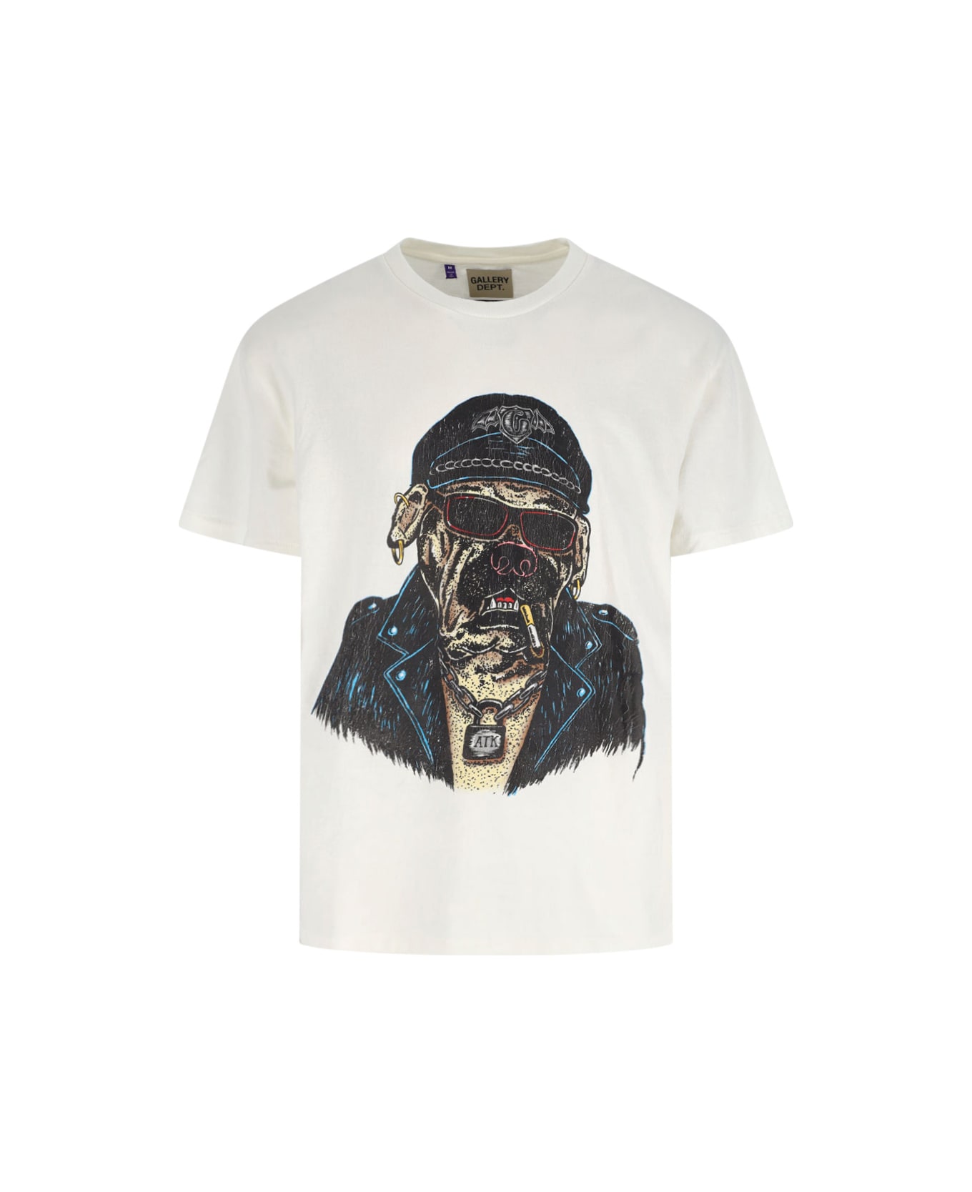 Gallery Dept. 'OCT Biker dog' white cotton crew neck t-shirt with dropped shoulders, maxi multicolor print on the front, logo print on the back, ribbed trims, straight hem. Composition: 100% Cotton