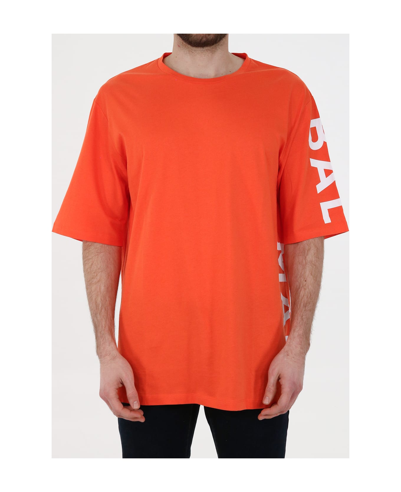 Short-sleeved crewneck t-shirt in orange cotton. It features white Balmain logo on sleeve, logo patch on the back and oversized fit.