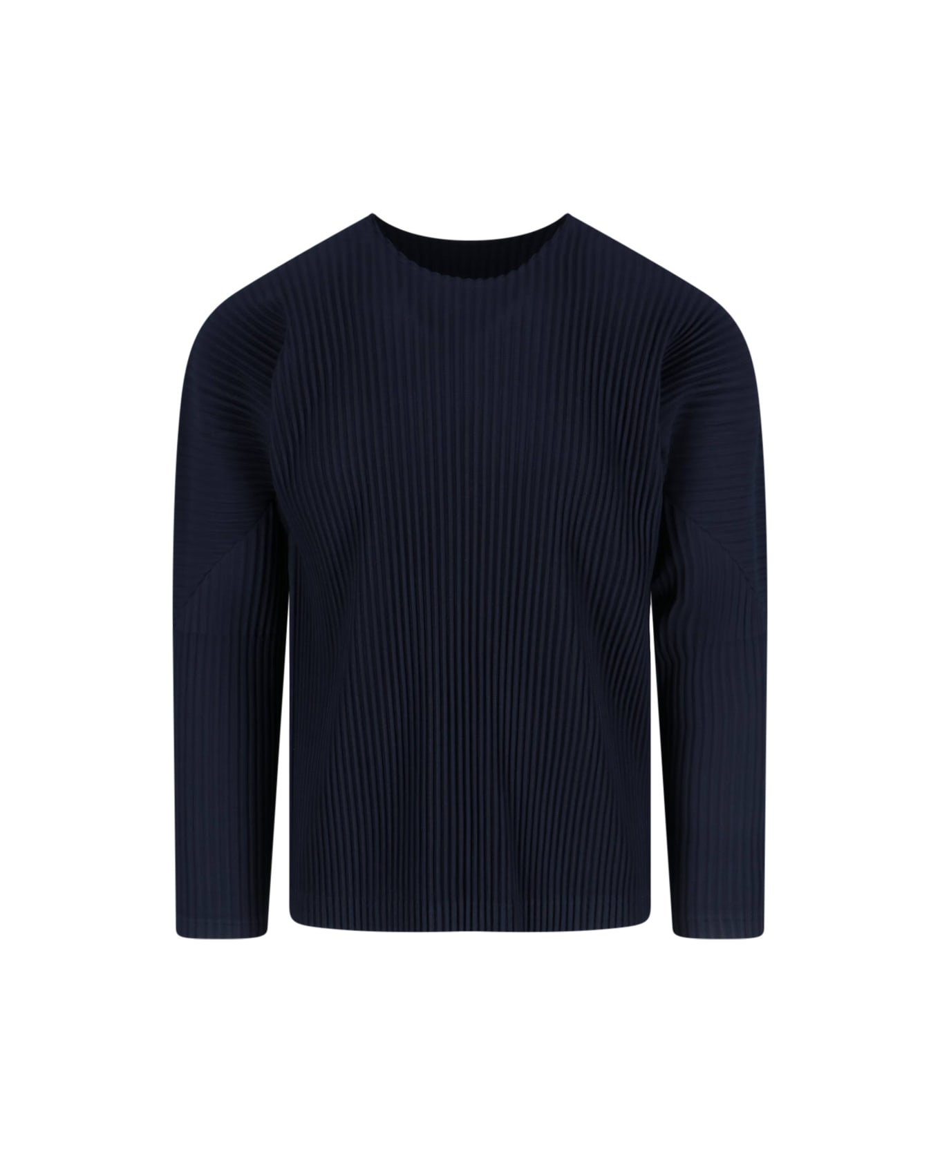 Homme Plissé pleated t-shirt in navy blue fabric with crew neck, structured shoulders, straight hem.