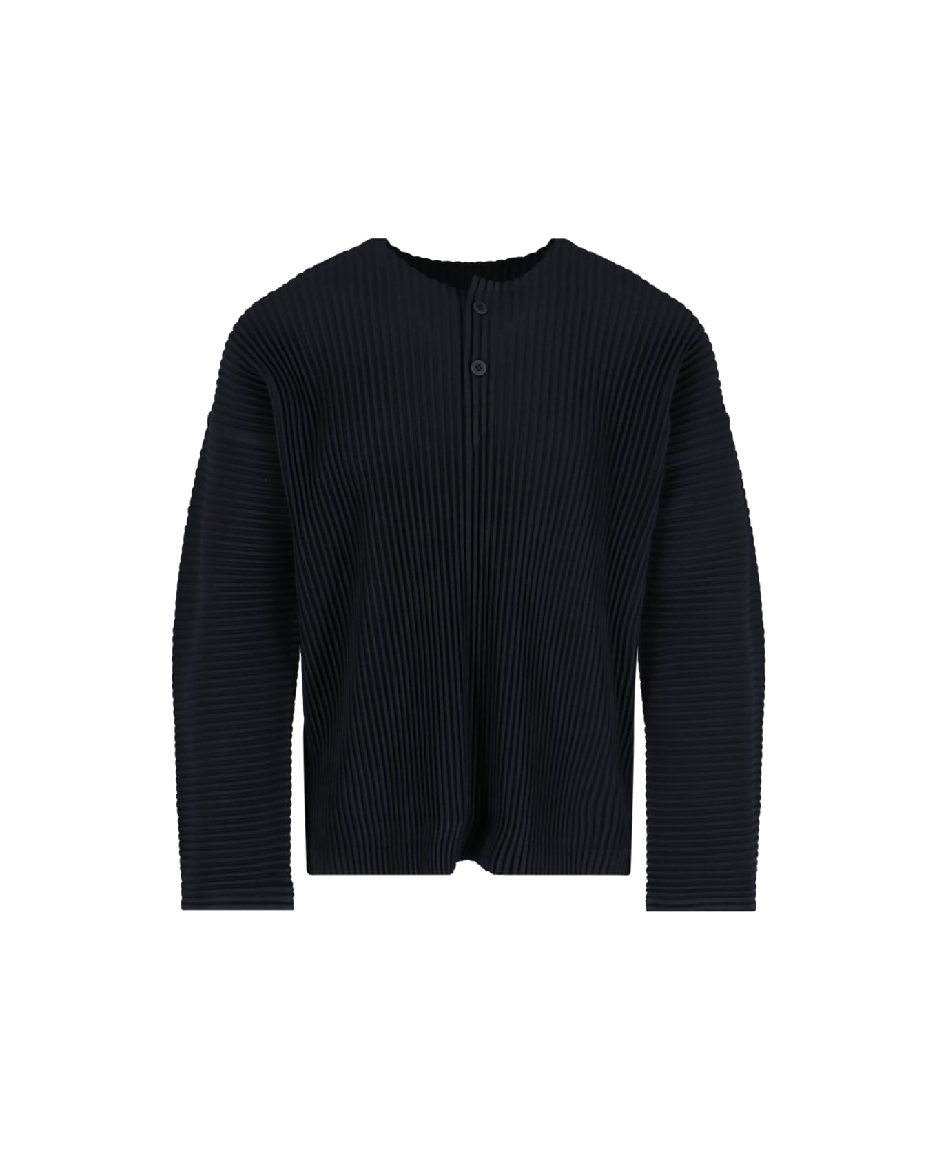 Homme Plissé pleated t-shirt in black fabric with crewneck, front button closure, dropped shoulders, structured sleeves, straight hem.
