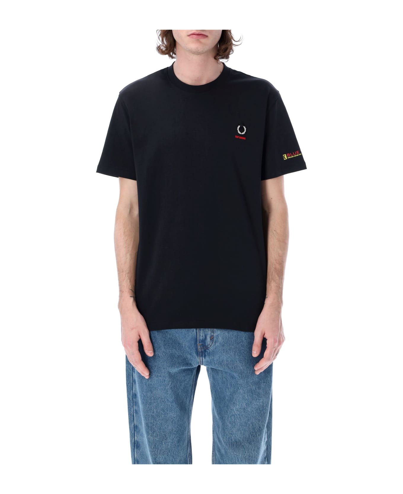 Cotton Printed Sleeve T-shirt By Fred Perry Raf Simons. Featuring: Crewneck Short Sleeves Print At Left Sleeve Raf Simons Embroidery And Metal Laurel Wreath At Chest Straight Hem Model Is 1,90 M Tall And He Is Wearing Size L