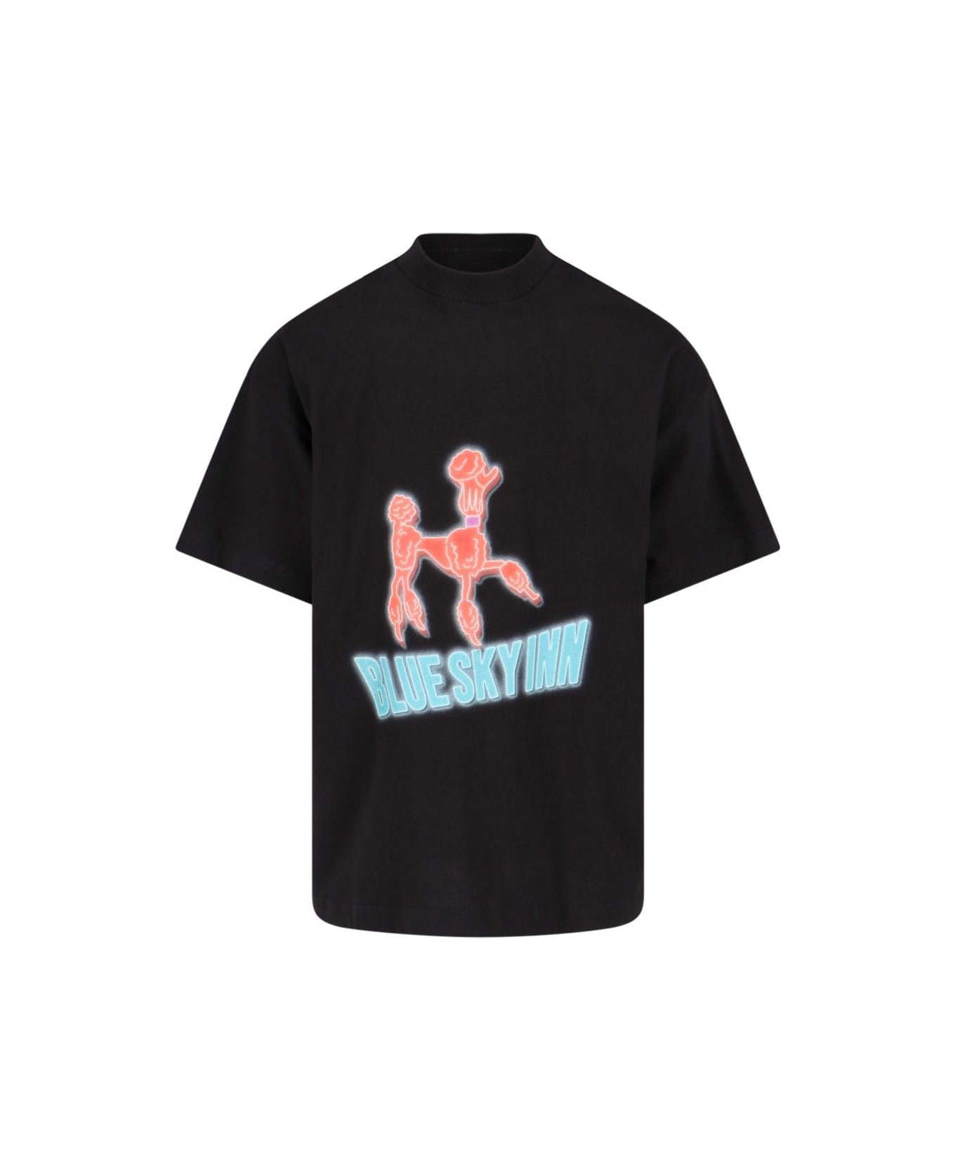 Blue Sky Inn printed black cotton, ribbed crewneck t-shirt with short sleeves, red print at the front, an blue logo print at the front and a straight hem.