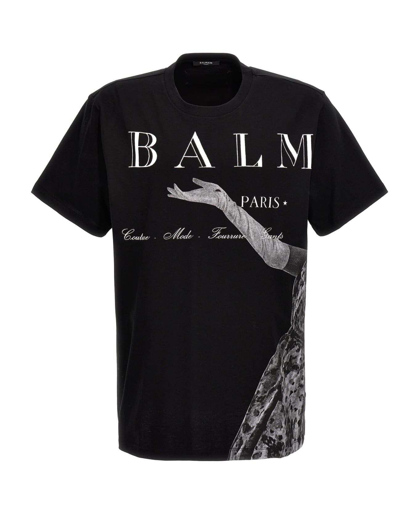 Cotton T-shirt with front print, back logo patch, crewneck, and short sleeves.