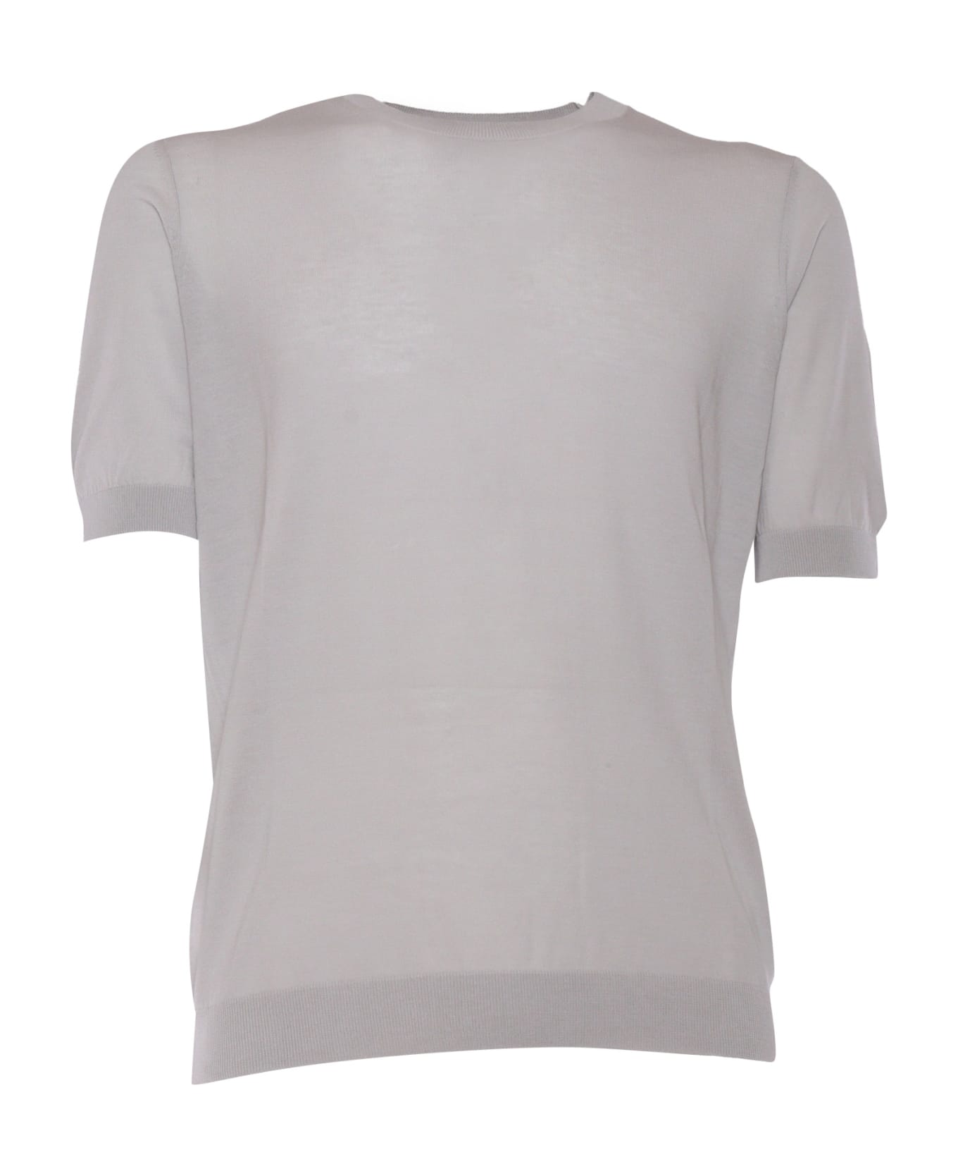 Gray short-sleeved crew-neck cotton sweater, ribbed hems.