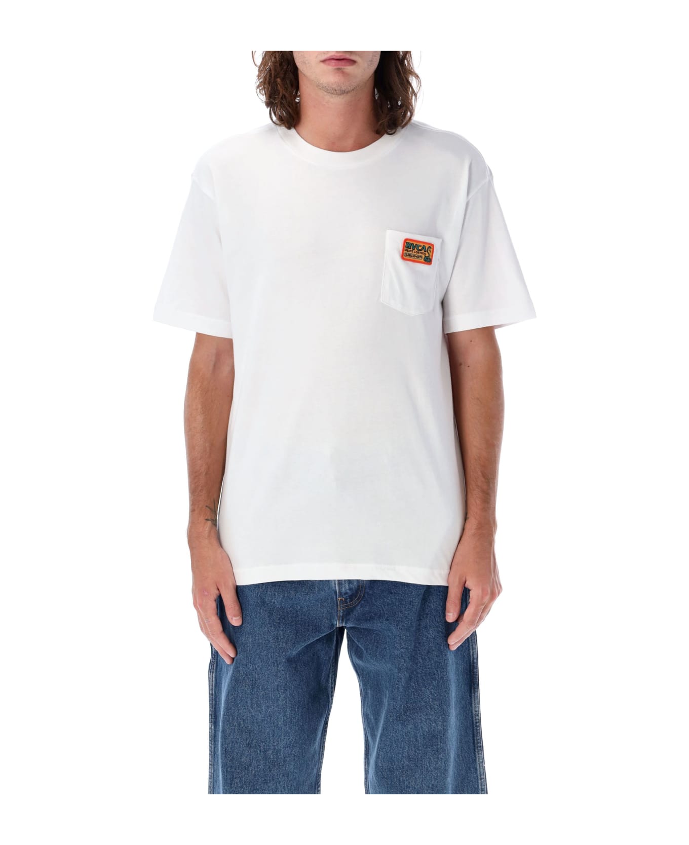 Skate Contro Tee By Rvca. Featuring: Crew Neck Short Sleeves Patch Pocket At Chest With Embroidered Patch Print At Back Regular Fit Model Is 1,90 M Tall And He Is Wearing Size L