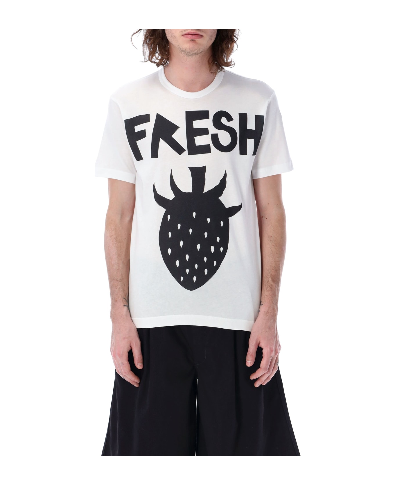 Cotton Strawberry T-shirt By Comme Des Garçons Shirt. Featuring: Crew Neck Short Sleeves Large Black Graphic Print At Front Straight Hem The Model Is 1,90 M Tall And He's Wearing Size L