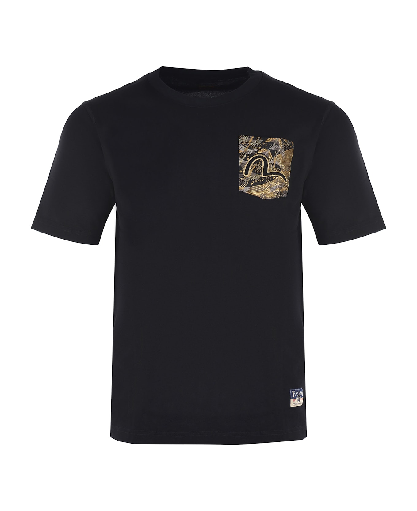 T-shirt Evisu black cotton. Short sleeves. Raised pocket on the front with contrasting embroidered logo. Regular Fit. 100% cotton